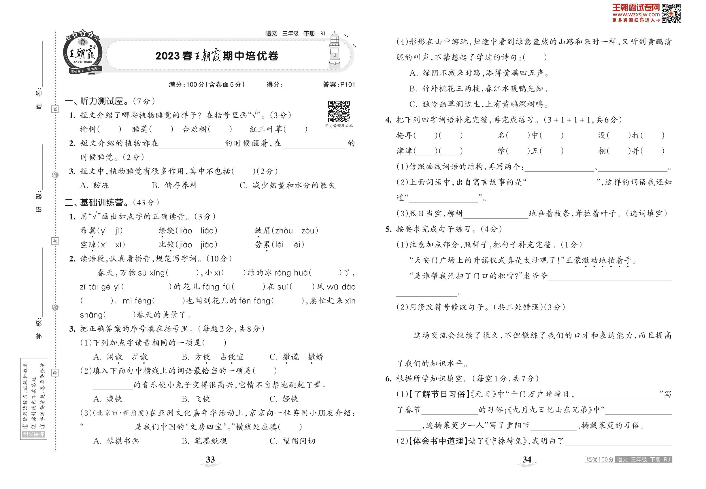 2023下册三年级语文人教版 2023春王朝霞期中培优卷