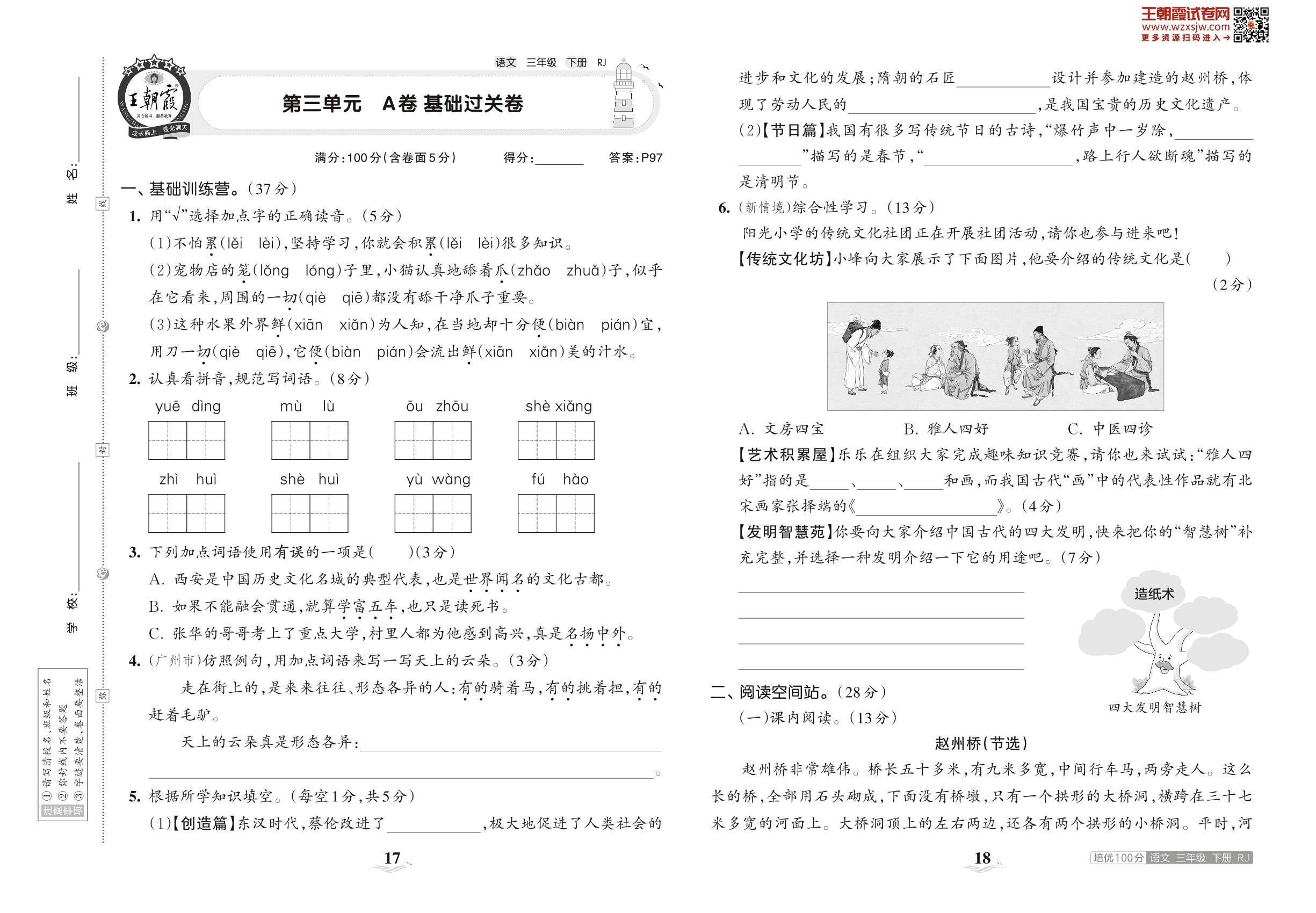 2023下册三年级语文人教版 第三单元 A卷 基础过关卷