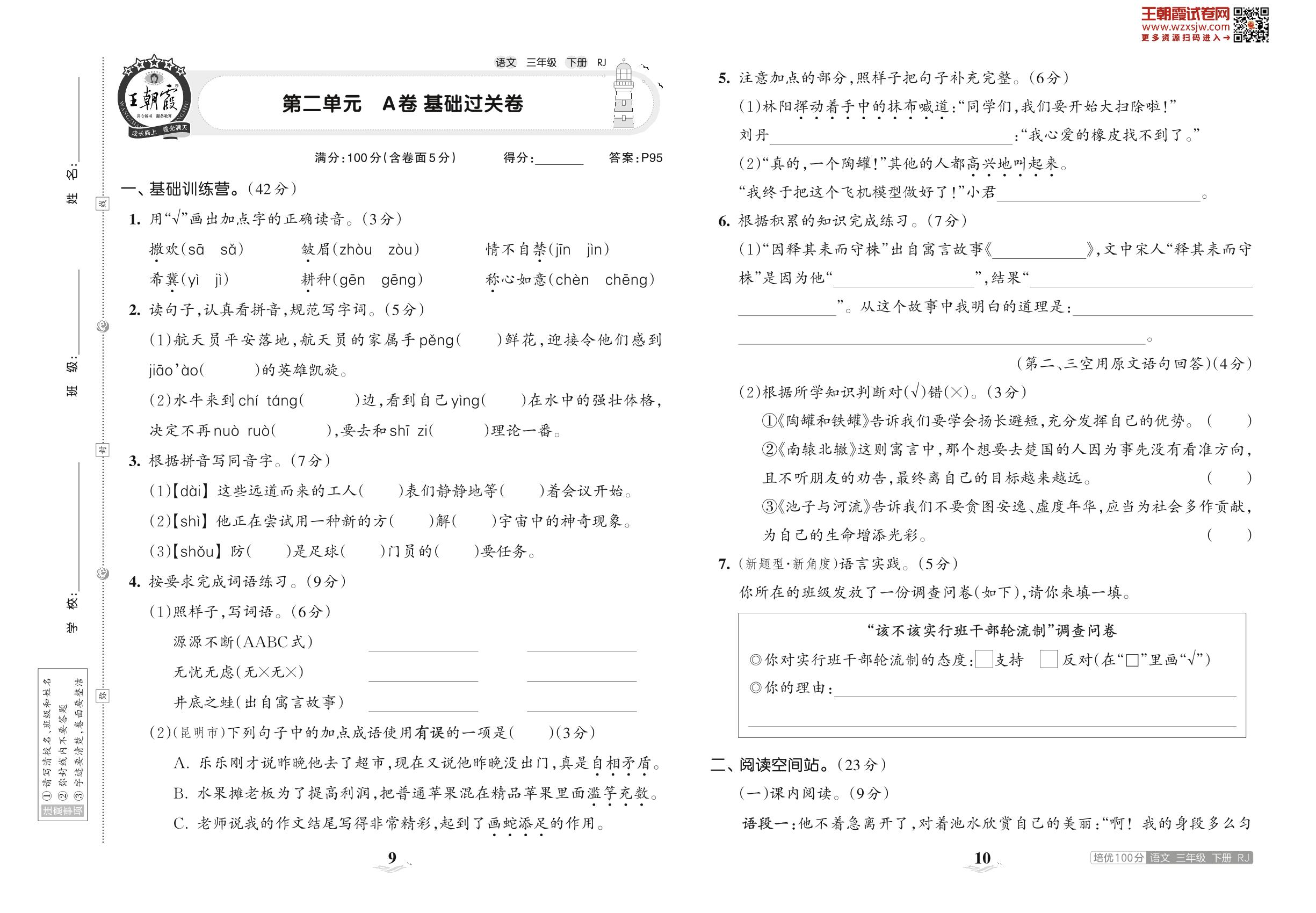 2023下册三年级语文人教版 第二单元 A卷 基础过关卷