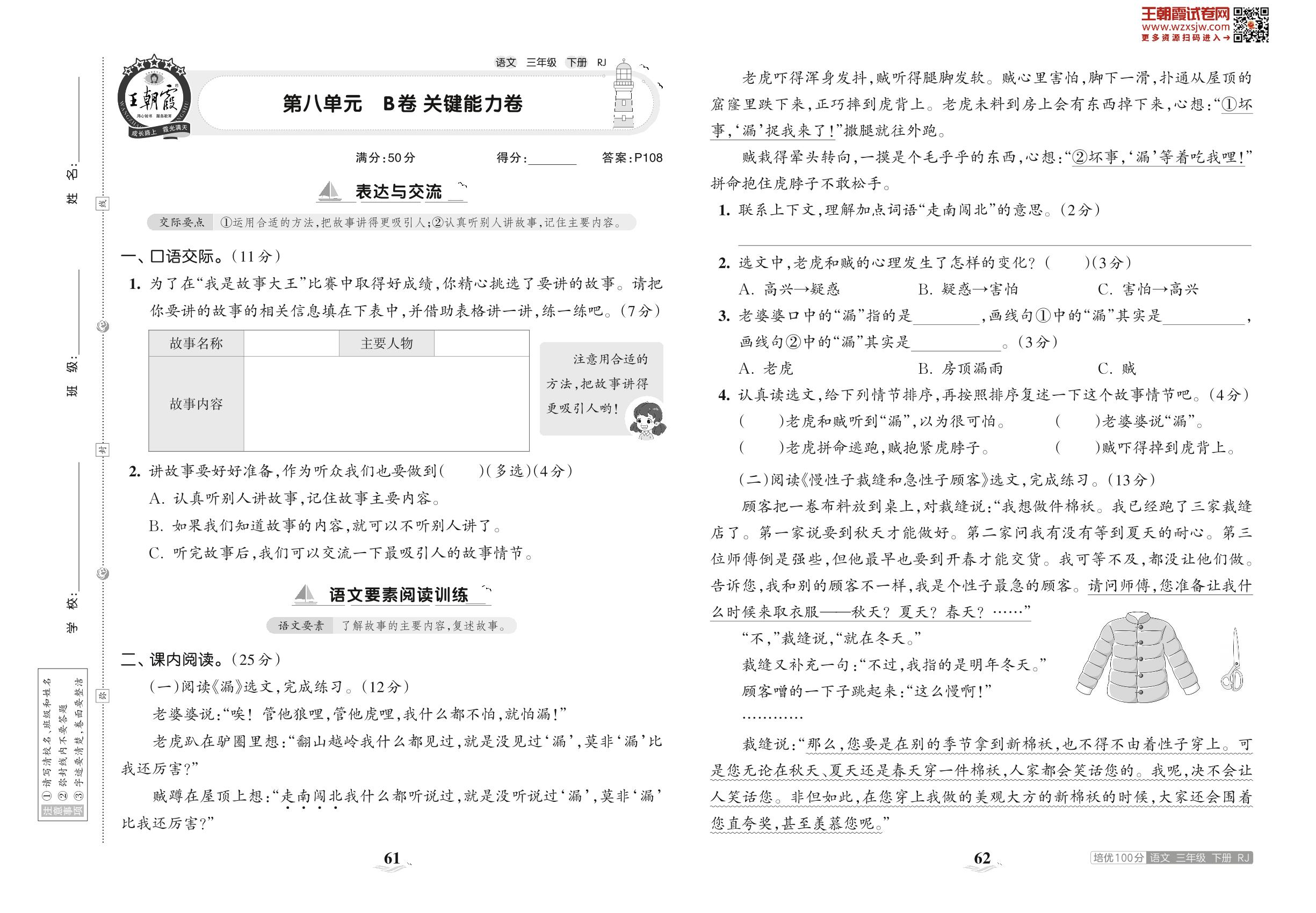 2023下册三年级语文人教版 第八单元 B卷 关键能力卷