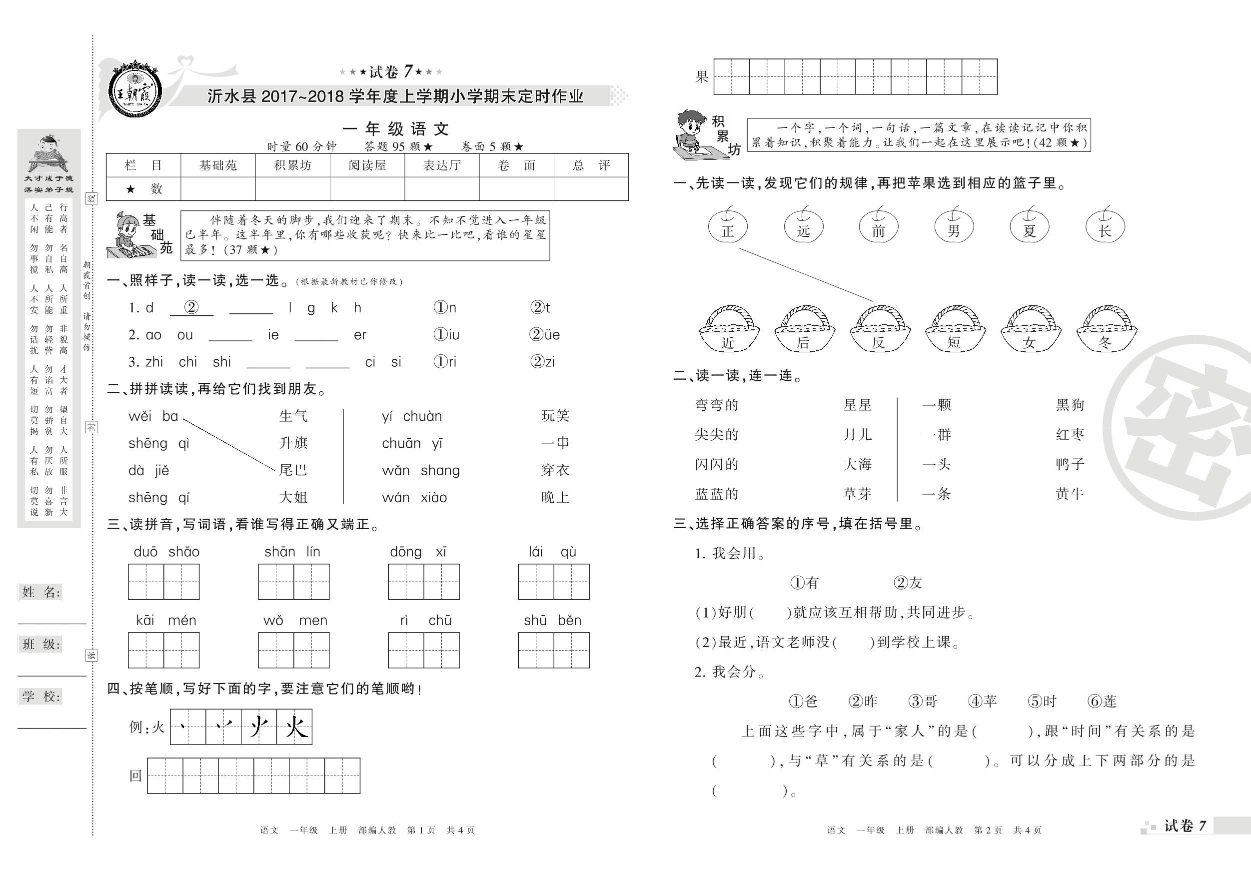2017-2018学年第一学期临沂市沂水县一年级语文试卷(人教版)【7】