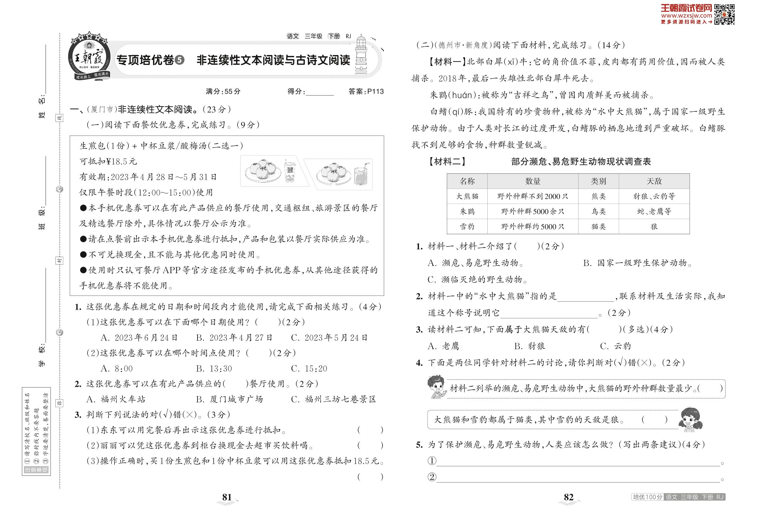 2023下册三年级语文人教版 专项培优卷5 非连续性文本阅读与古诗文阅读