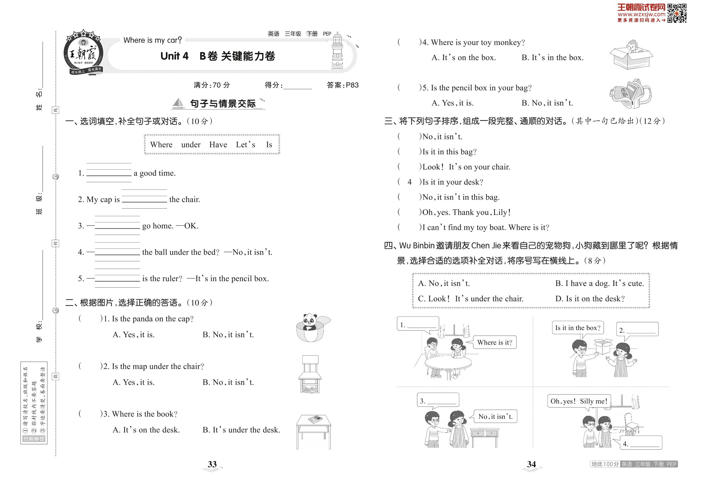 2023下册三年级英语人教PEP版 Unit 4 B卷 关键能力卷