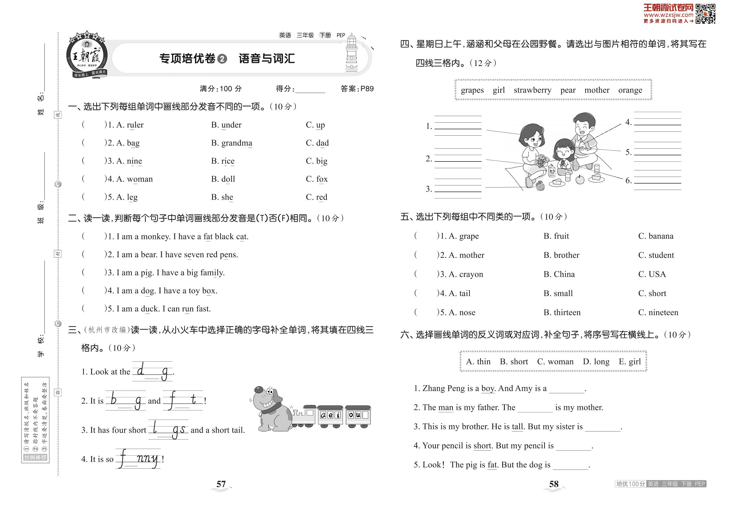 2023下册三年级英语人教PEP版 专项培优卷2 语音与词汇