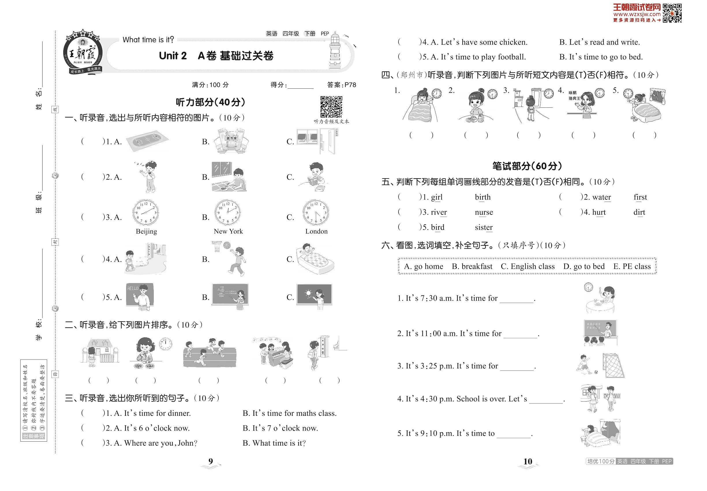 2023下册四年级英语人教PEP版 Unit 2 A卷 基础过关卷
