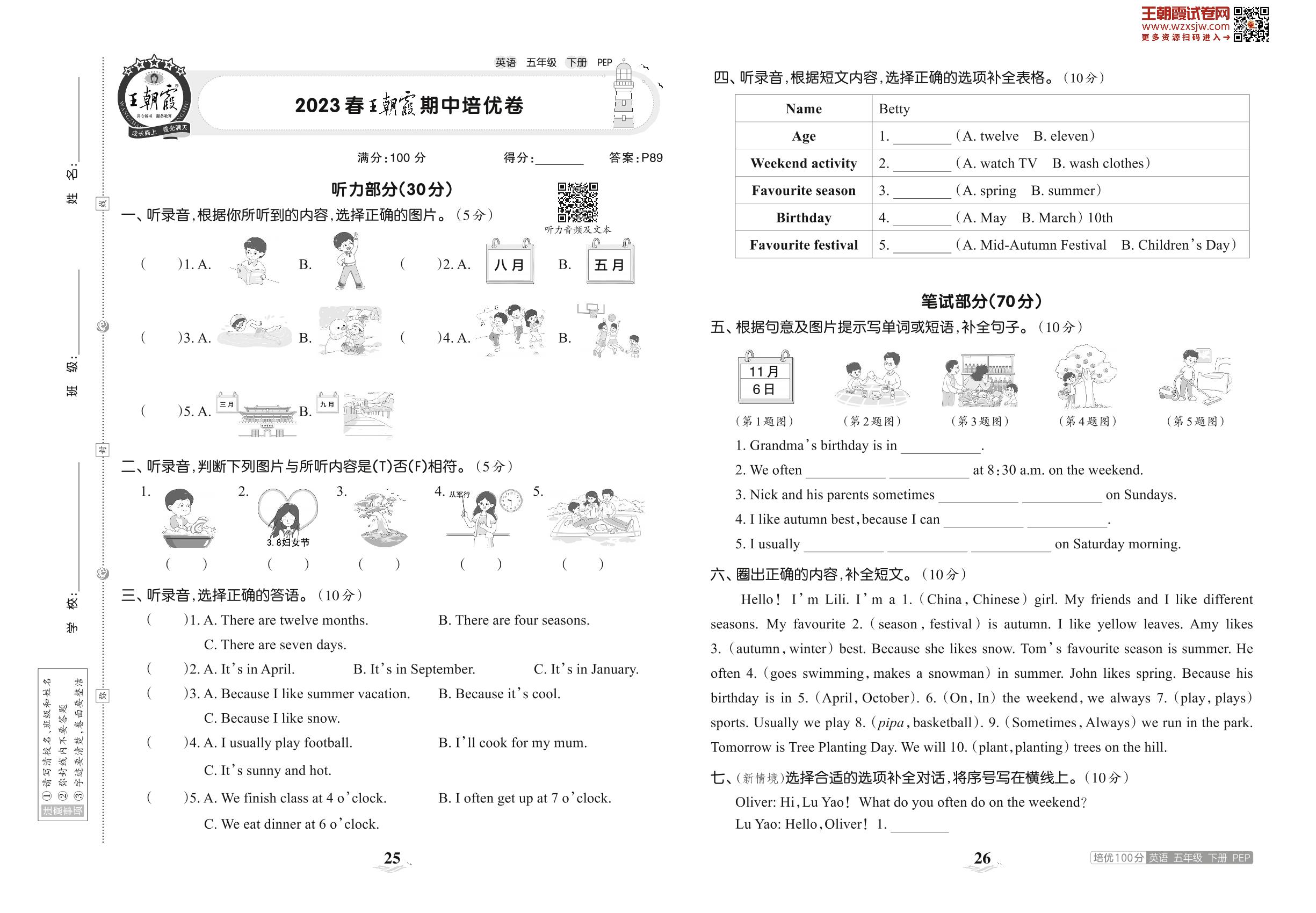 2023下册五年级英语人教PEP版 2023春王朝霞期中培优卷