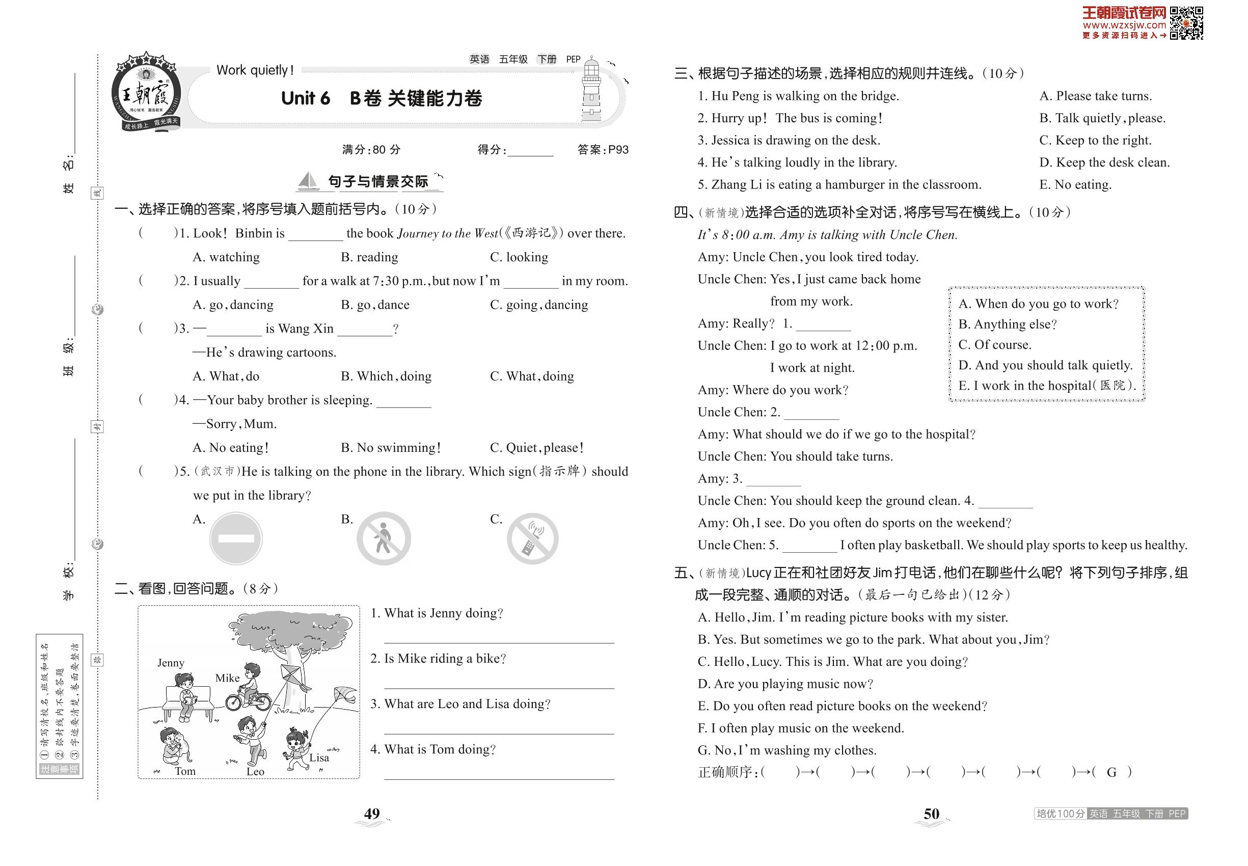 五年级英语人教PEP版(三起始)下册单元卷