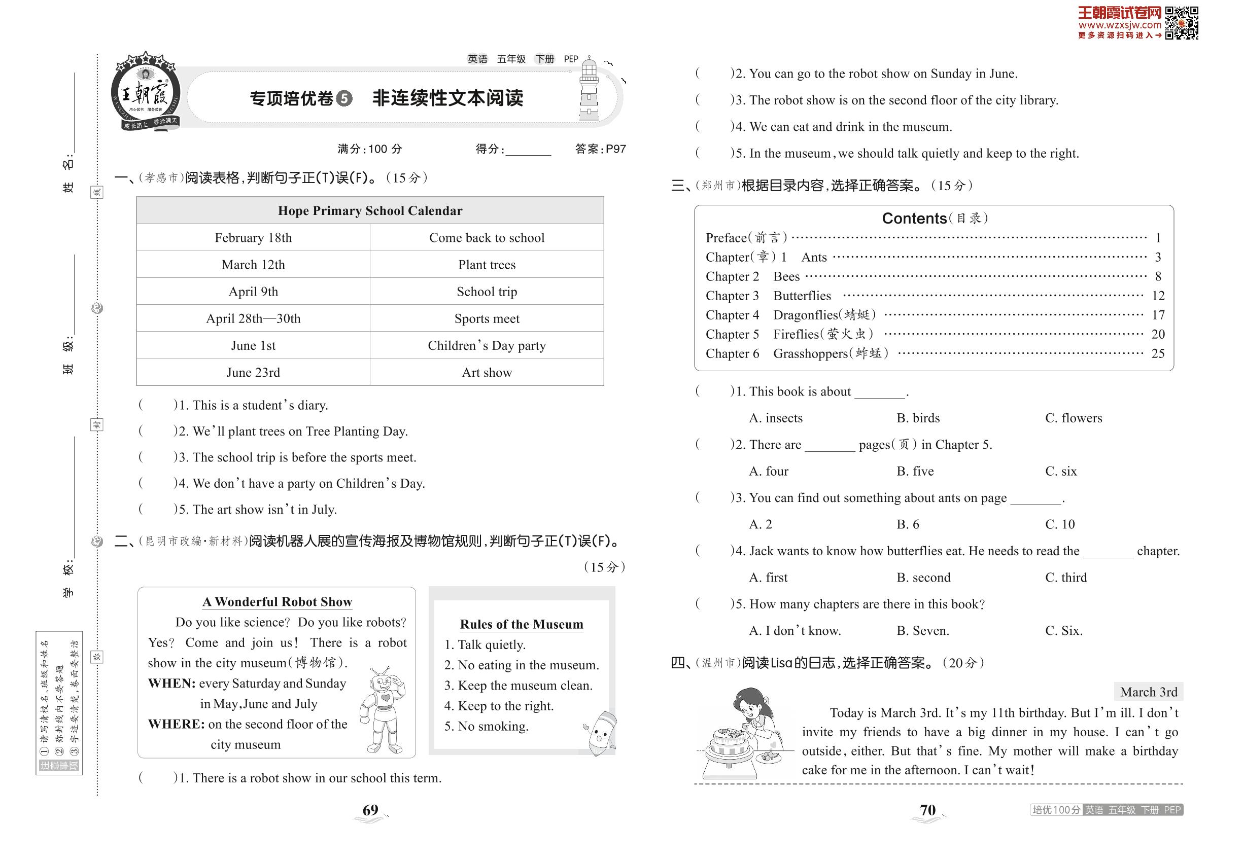 2023下册五年级英语人教PEP版 专项培优卷5 非连续性文本阅读