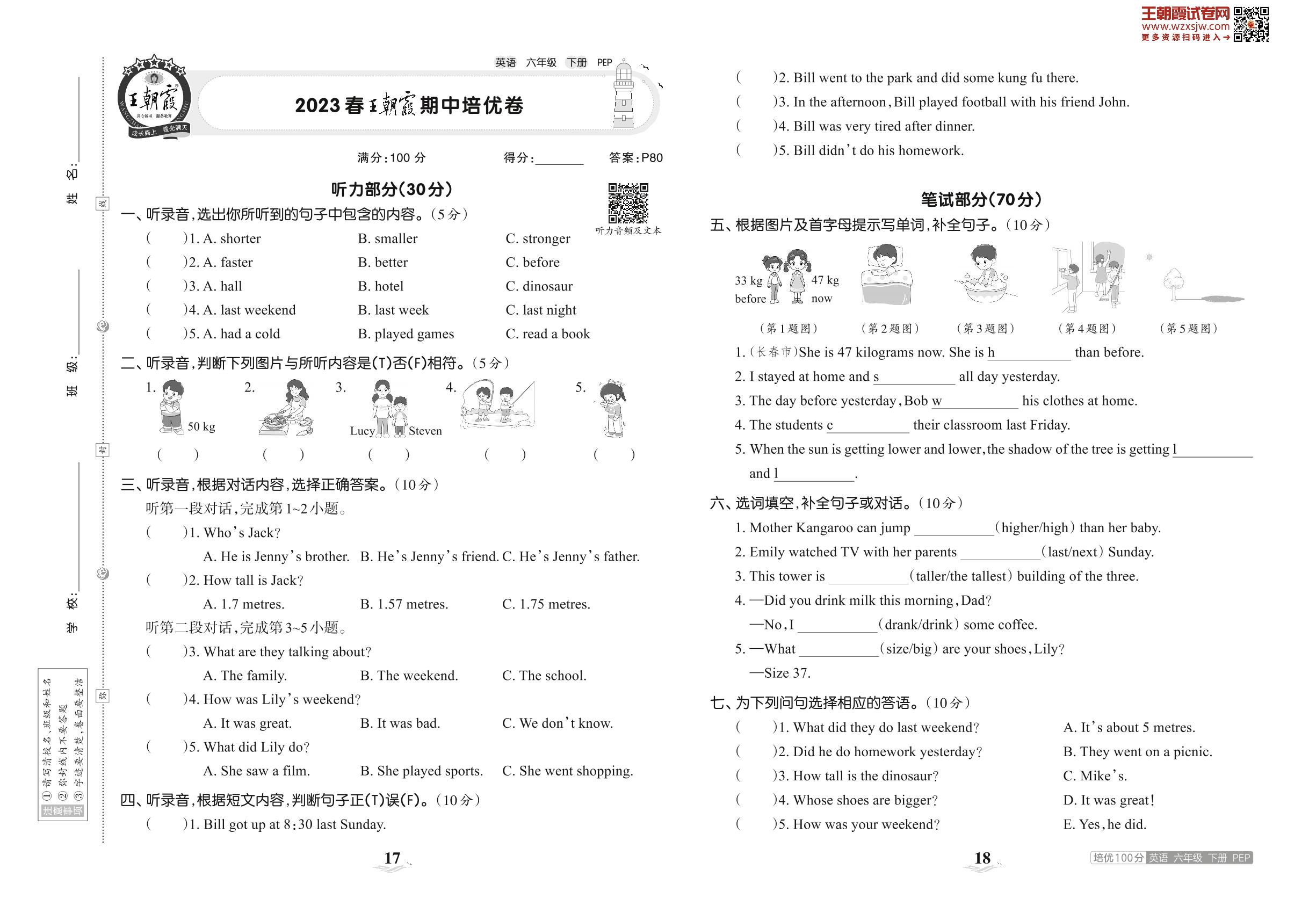 2023下册六年级英语人教PEP版 2023春王朝霞期中培优卷