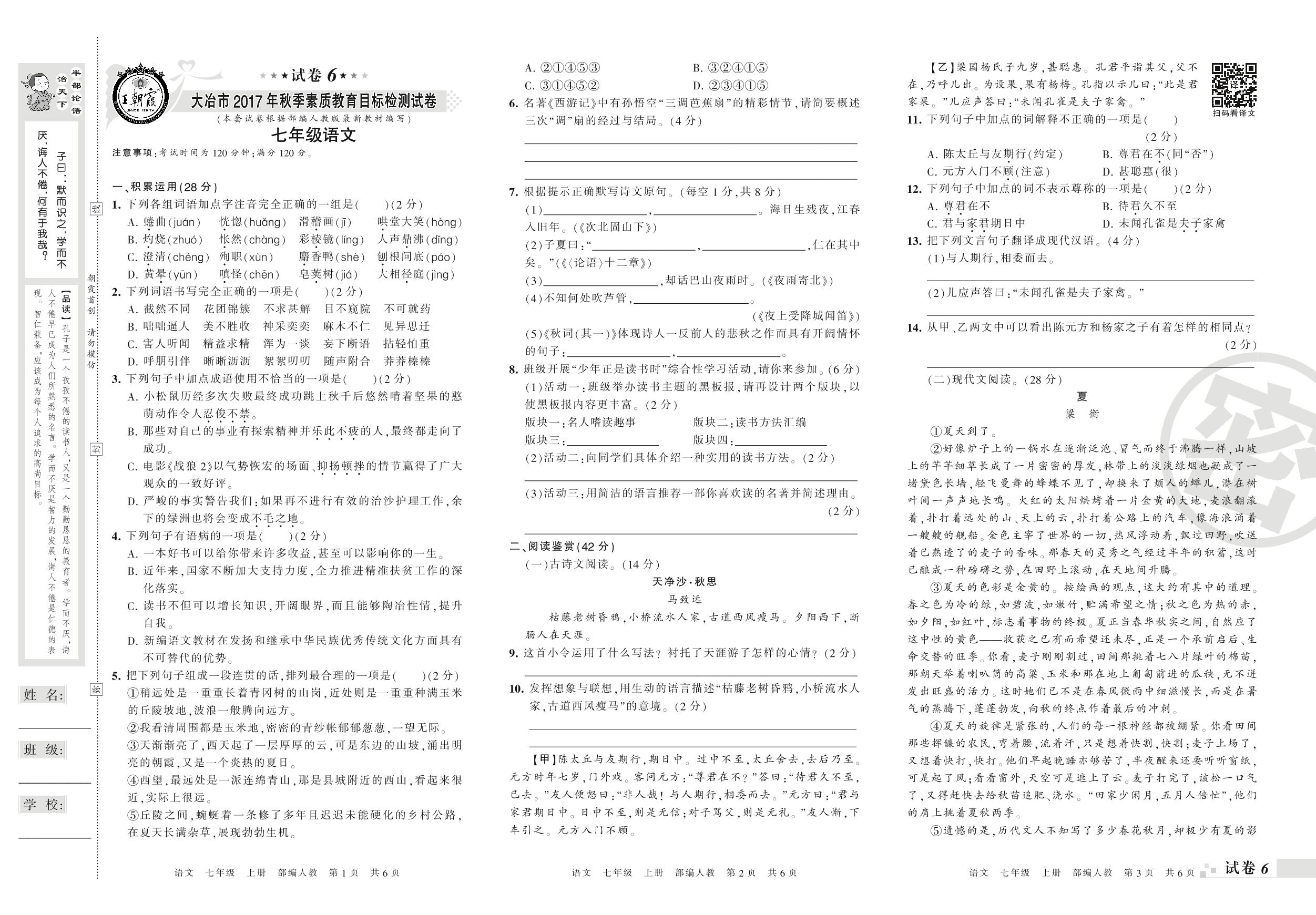 2017-2018学年第一学期大冶市七年级语文试卷(人教版)【6】