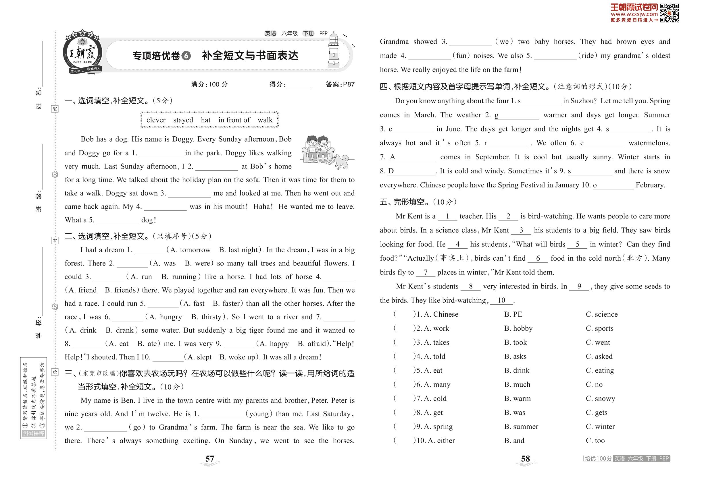 2023下册六年级英语人教PEP版 专项培优卷6 补全短文与书面表达