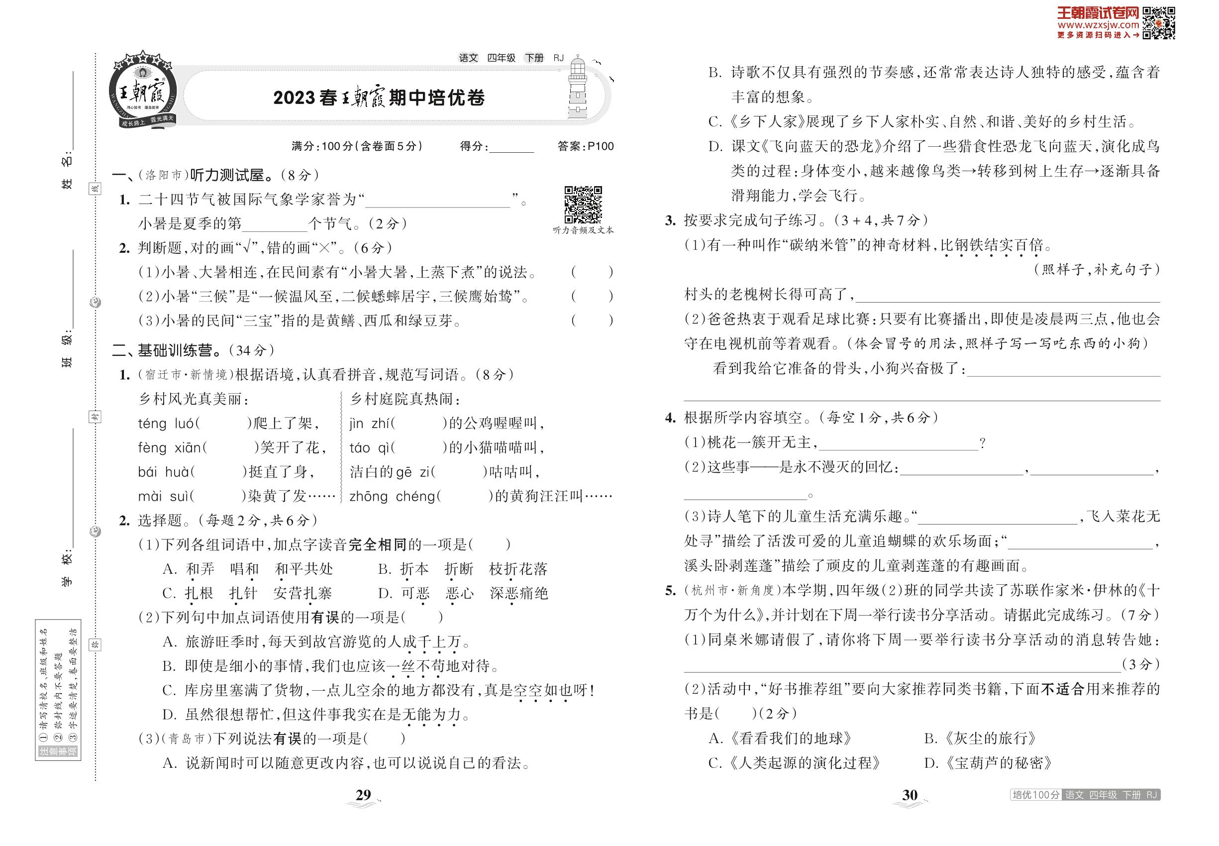 2023下册四年级语文人教版 2023春王朝霞期中培优卷