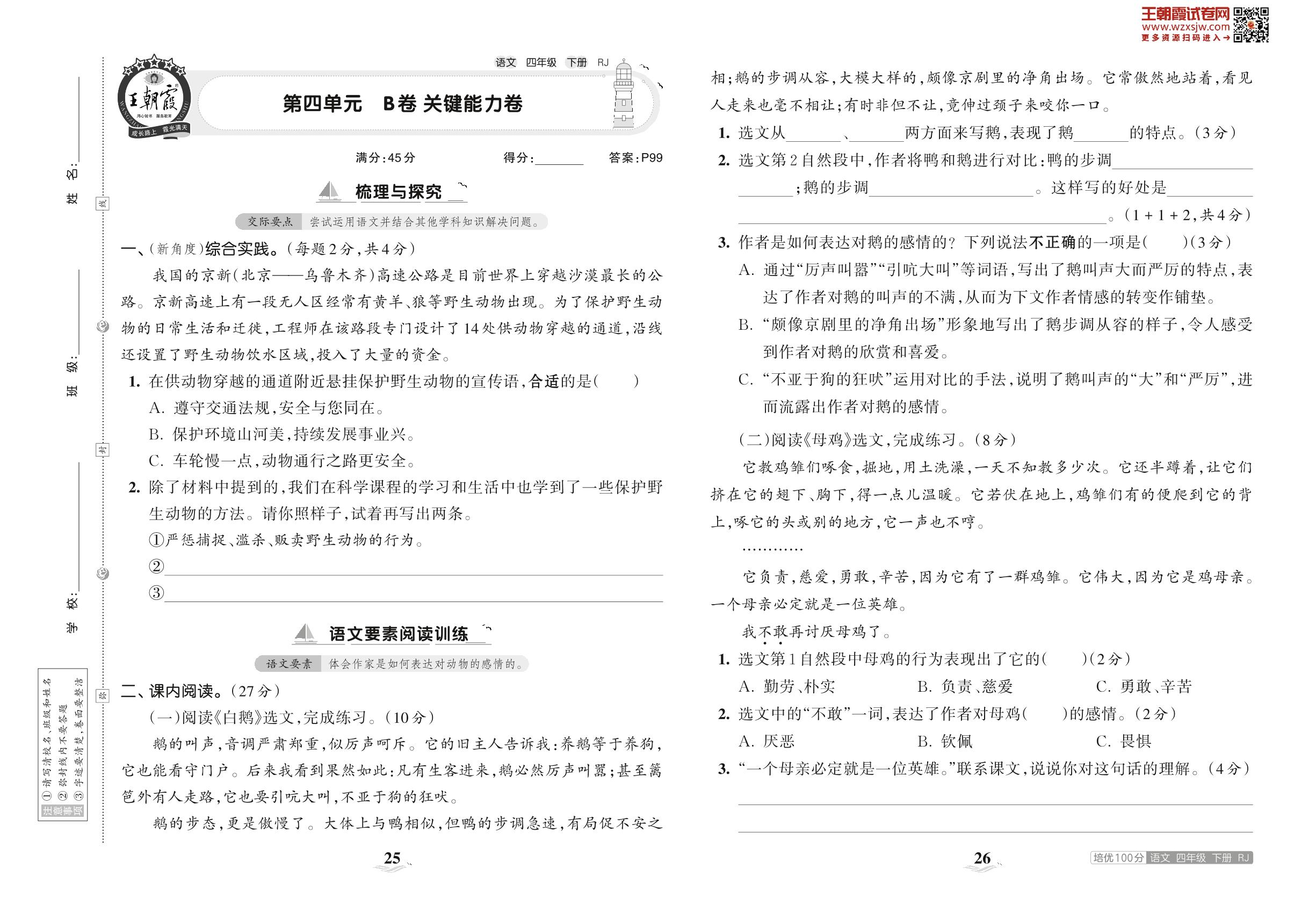 2023下册四年级语文人教版 第四单元 B卷 关键能力卷