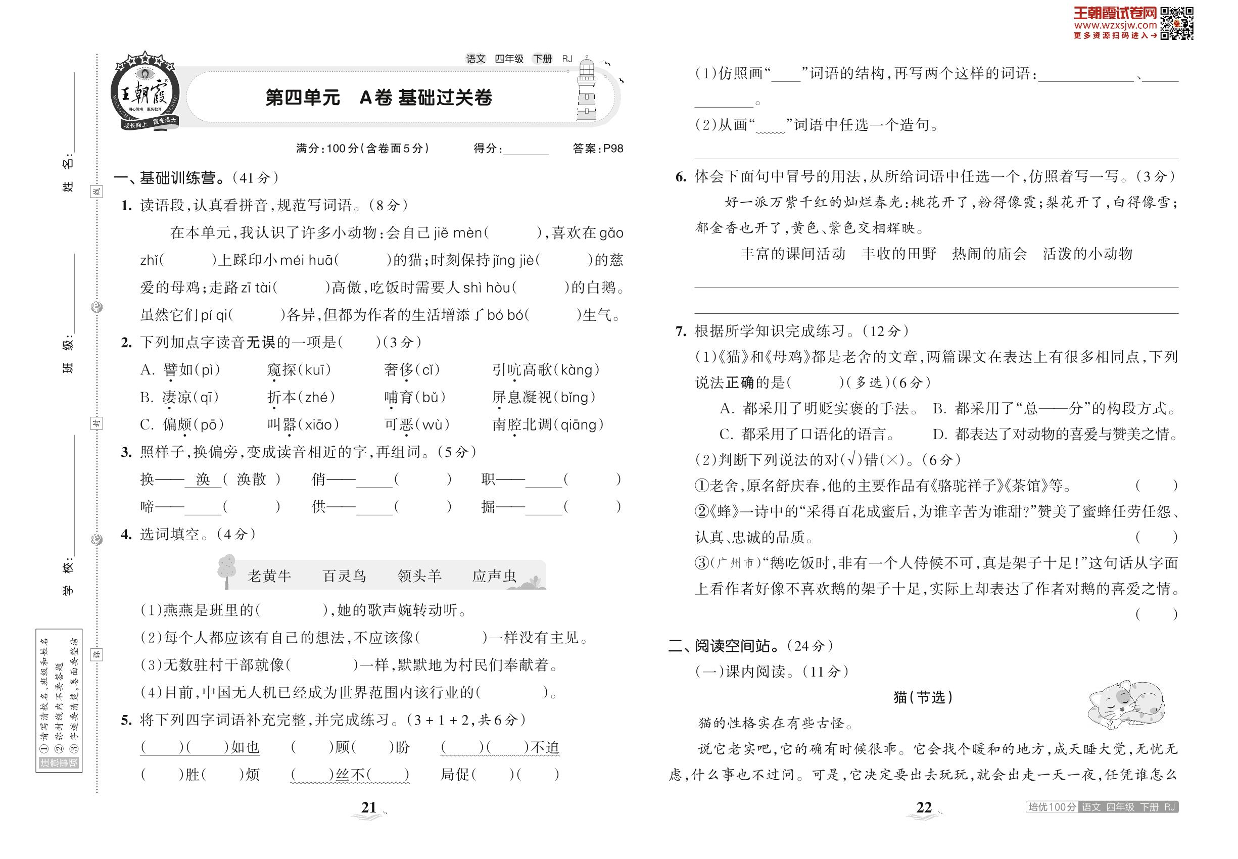 2023下册四年级语文人教版 第四单元 A卷 基础过关卷