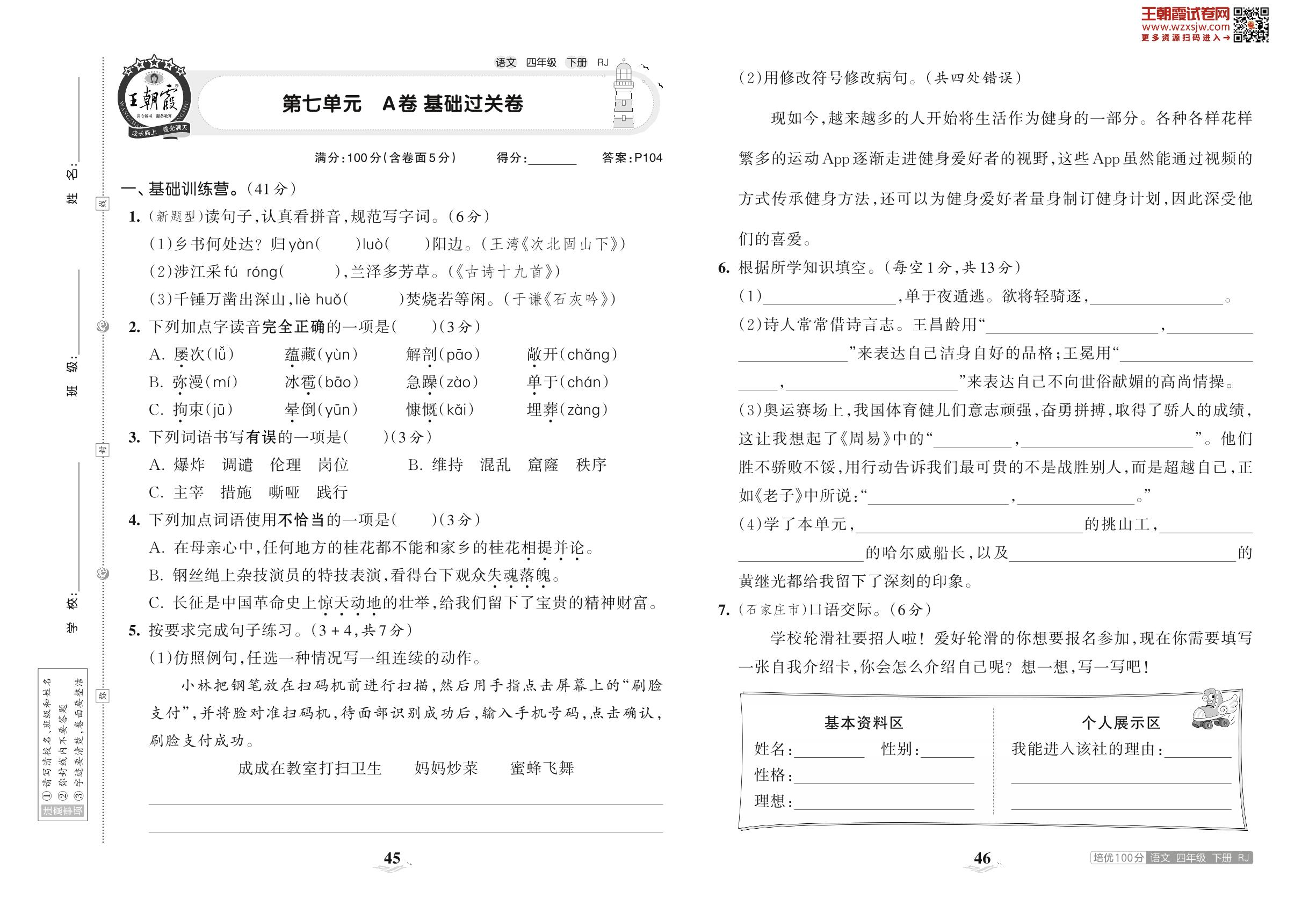 2023下册四年级语文人教版 第七单元 A卷 基础过关卷