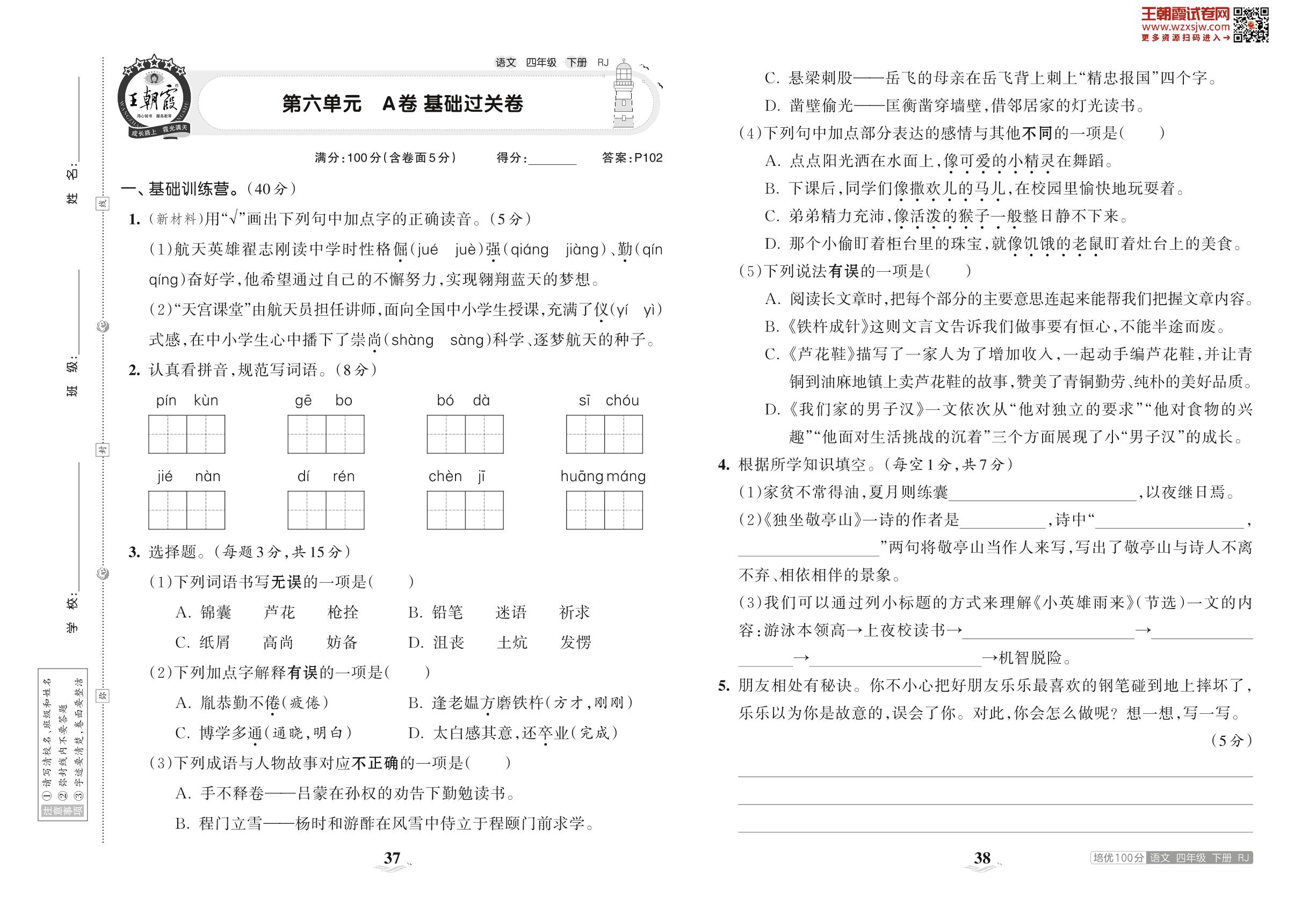 2023下册四年级语文人教版 第六单元 A卷 基础过关卷