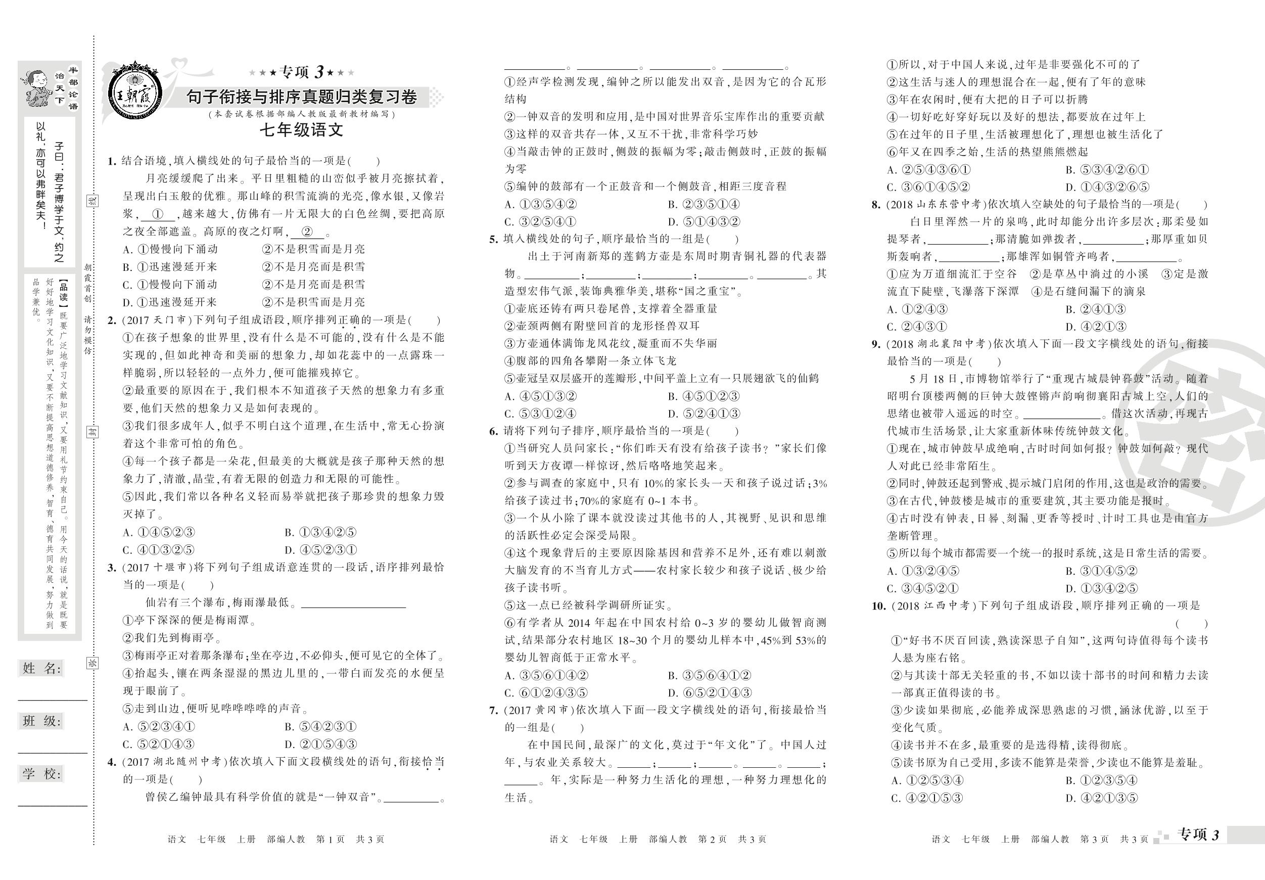 王朝霞期末专项卷——句子衔接与排序、病句真题归类复习卷七年级上册语文(人教版)_R210802161440【0】
