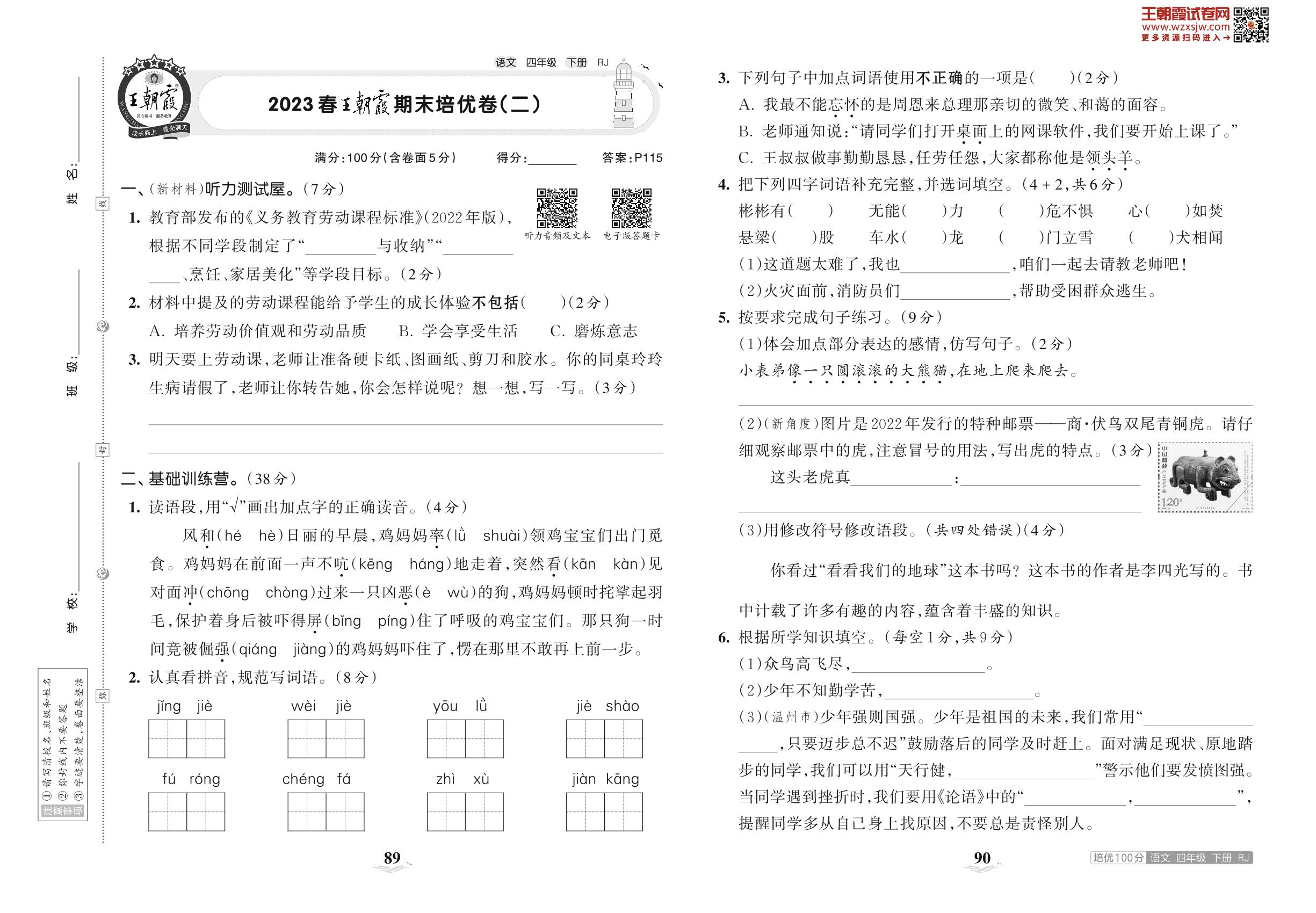 2023下册四年级语文人教版 2023春王朝霞期末培优卷(二)