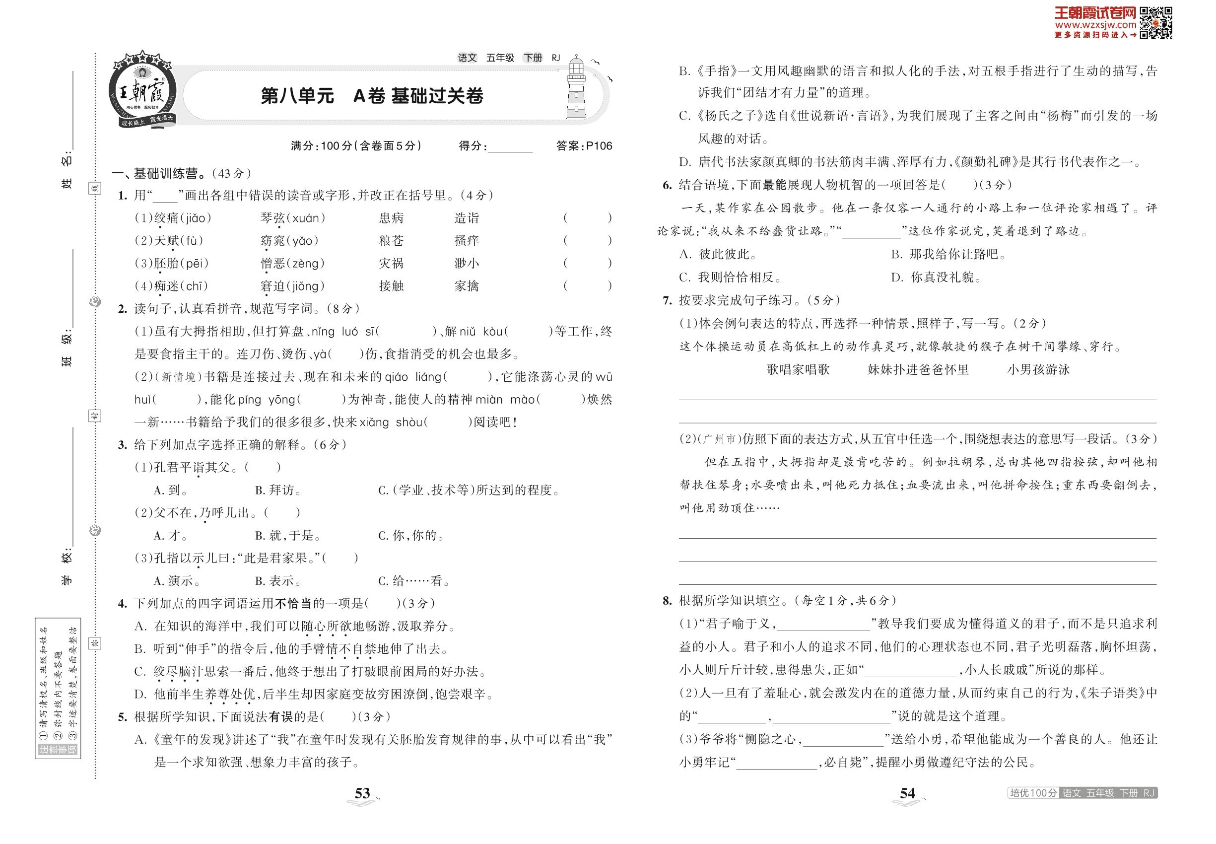 2023下册五年级语文人教版 第八单元 A卷 基础过关卷