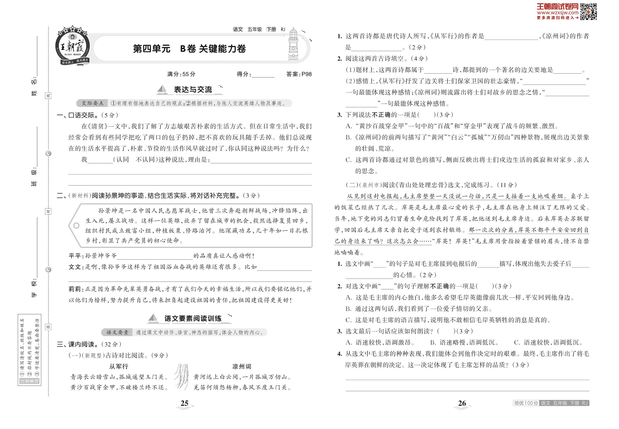 2023下册五年级语文人教版 第四单元 B卷 关键能力卷