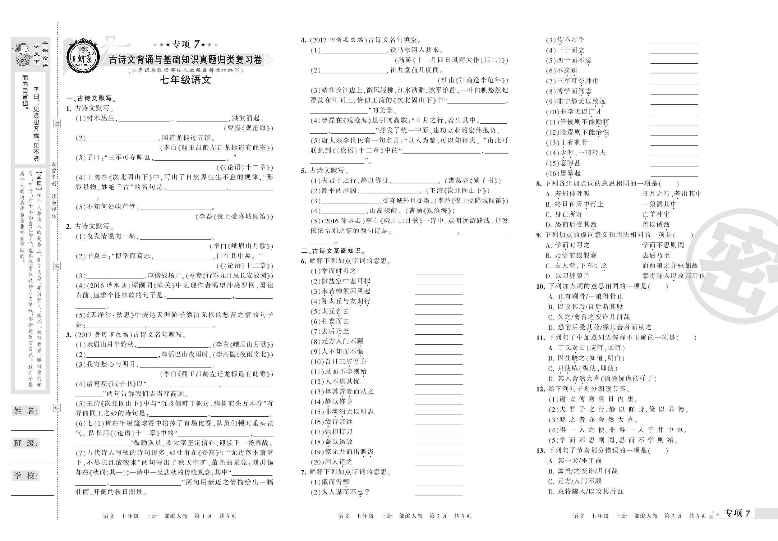 王朝霞期末专项卷——古诗文背诵与基础知识、古诗阅读真题归类复习卷七年级上册语文(人教版)_R210802161501【0】