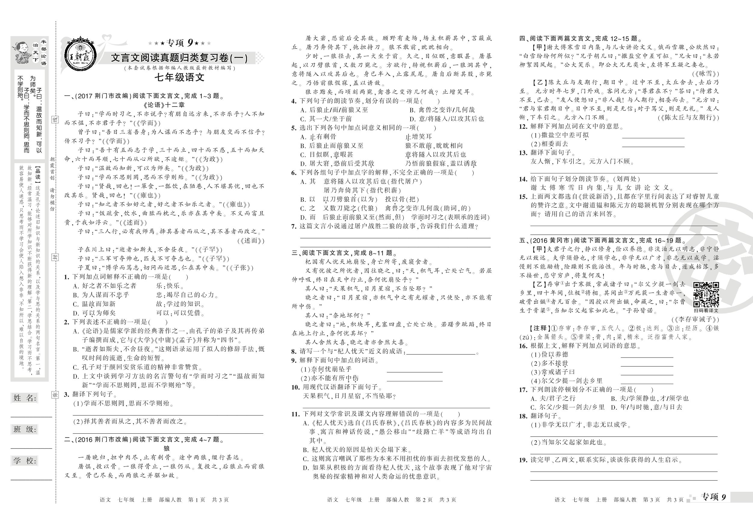 王朝霞期末专项卷——文言文阅读(一)(二)真题归类复习卷七年级上册语文(人教版)_R210802161509【0】