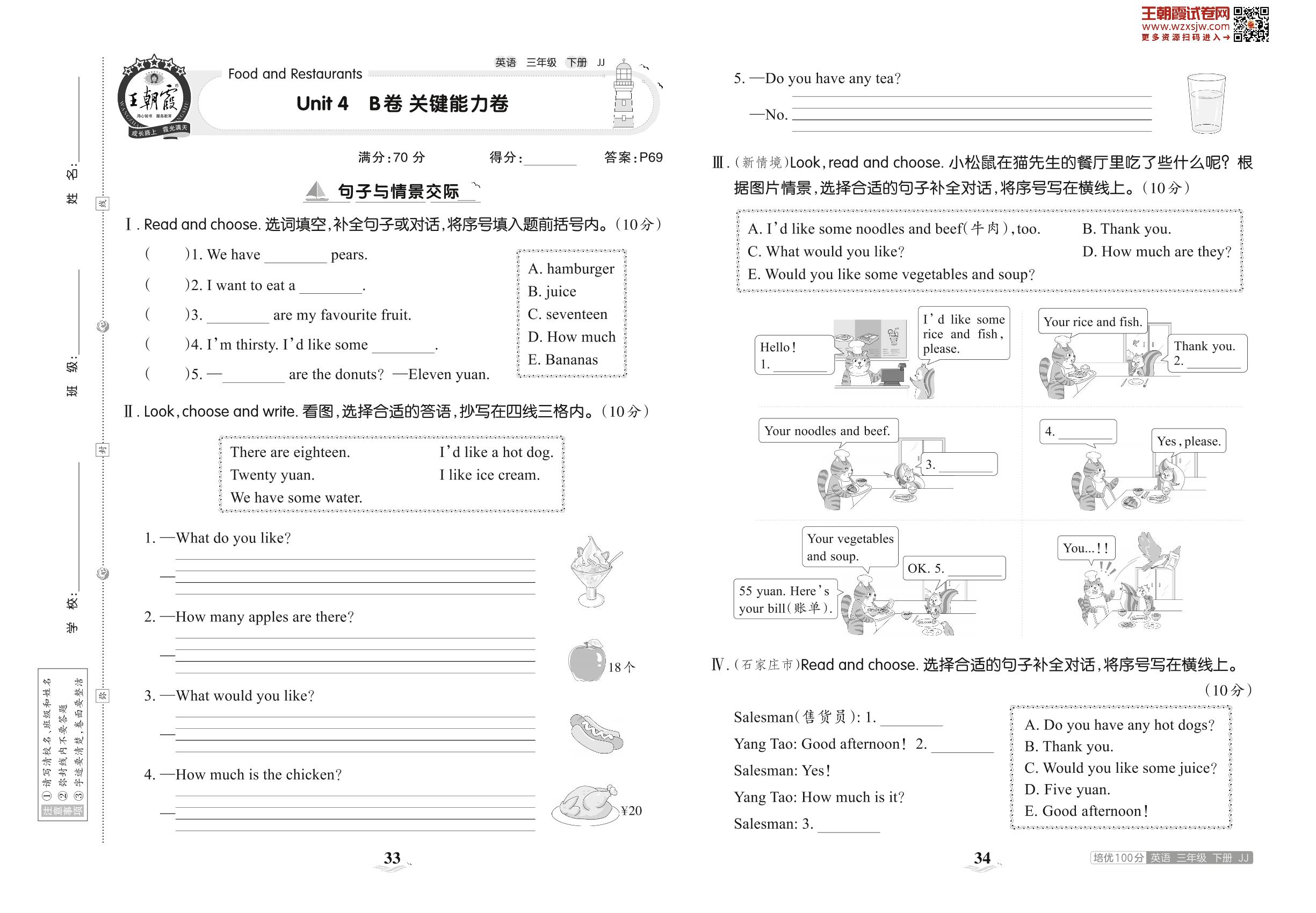 2023下册三年级英语冀教版 Unit 4 B卷 关键能力卷