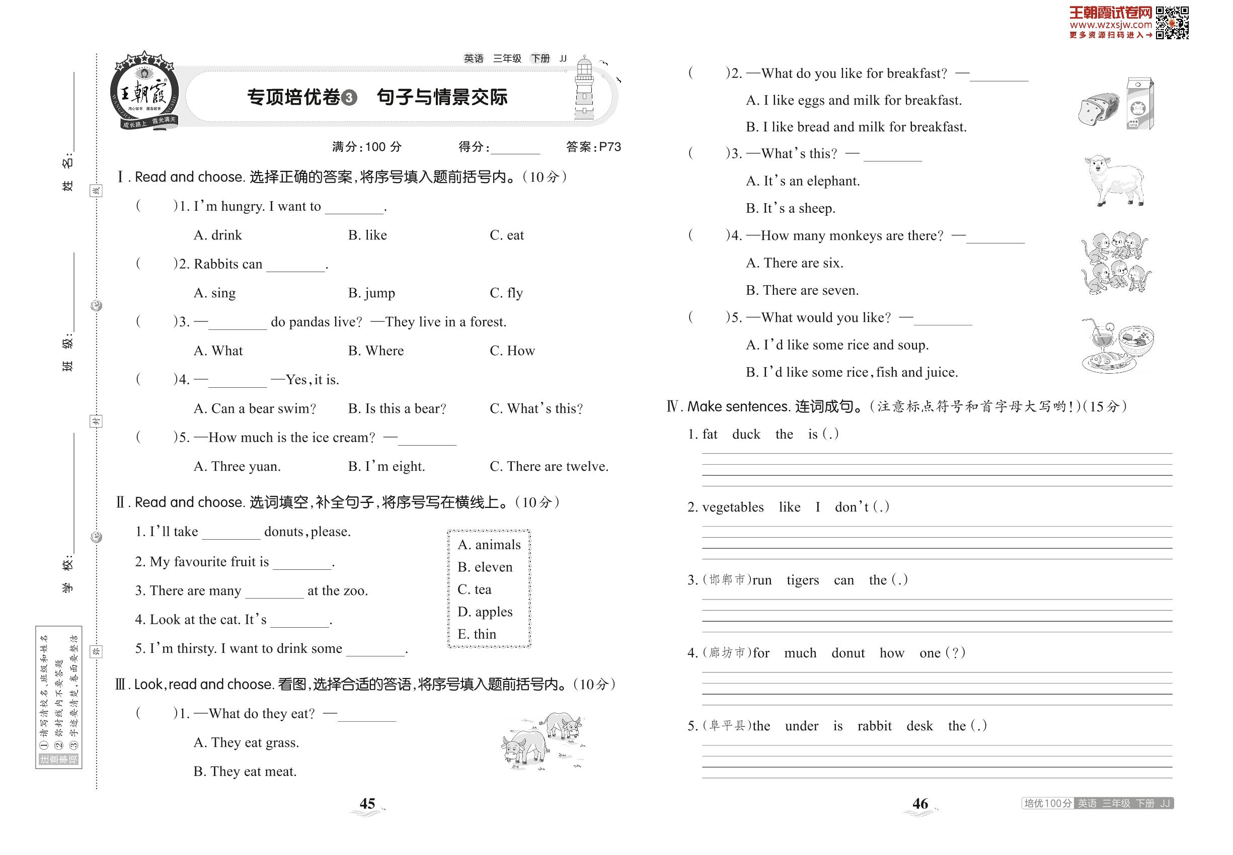 2023下册三年级英语冀教版 专项培优卷3 句子与情景交际
