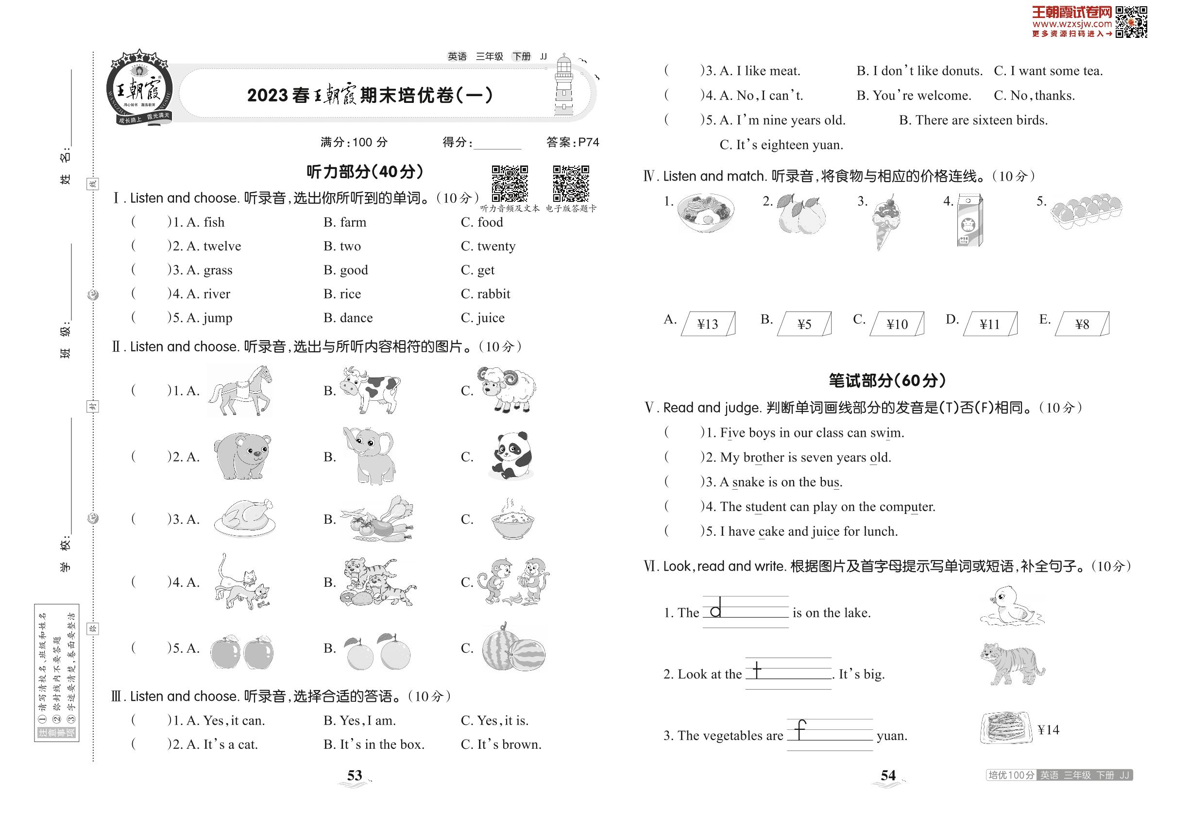 2023下册三年级英语冀教版 2023春王朝霞期末培优卷(一)