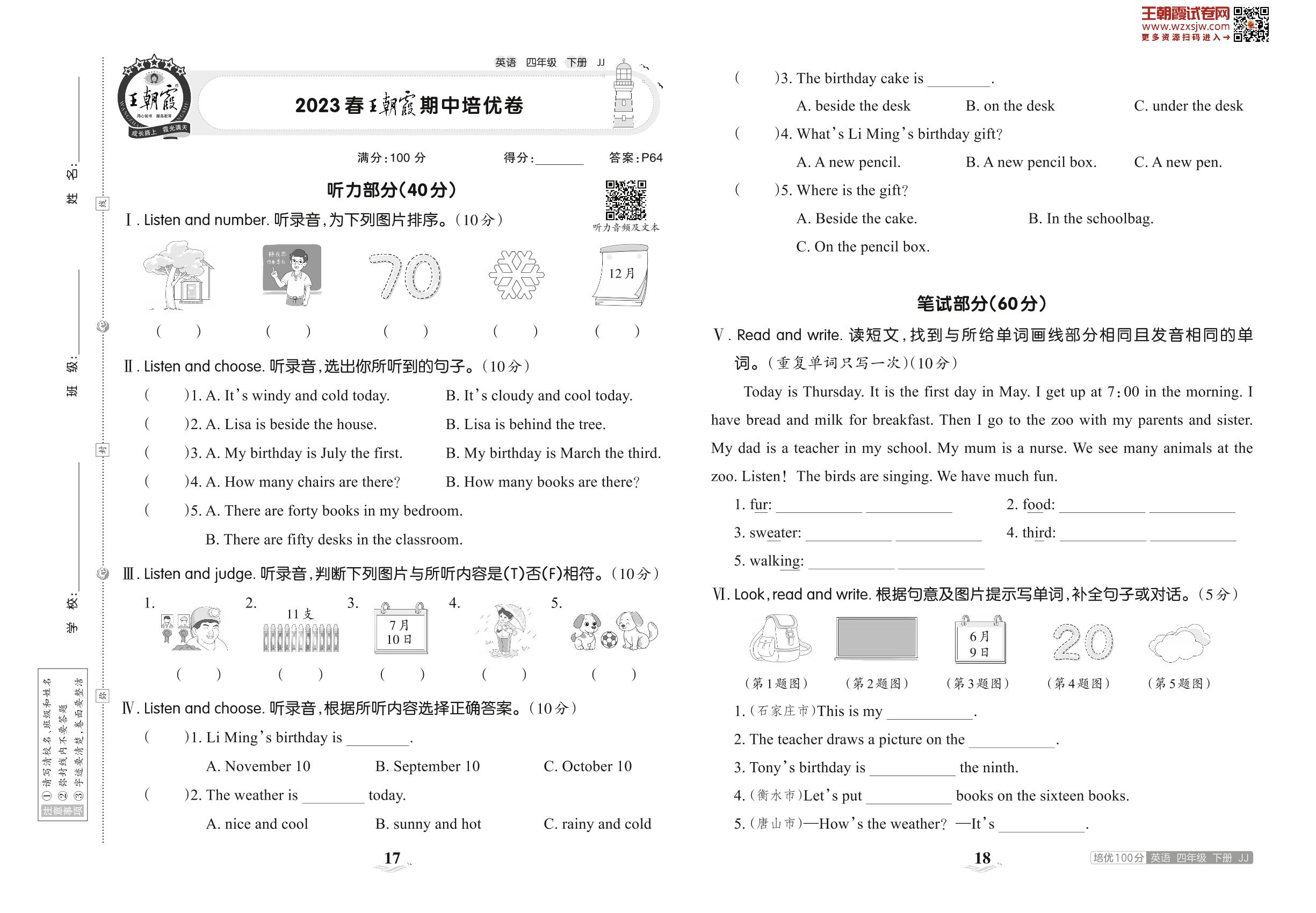 2023下册四年级英语冀教版 2023春王朝霞期中培优卷