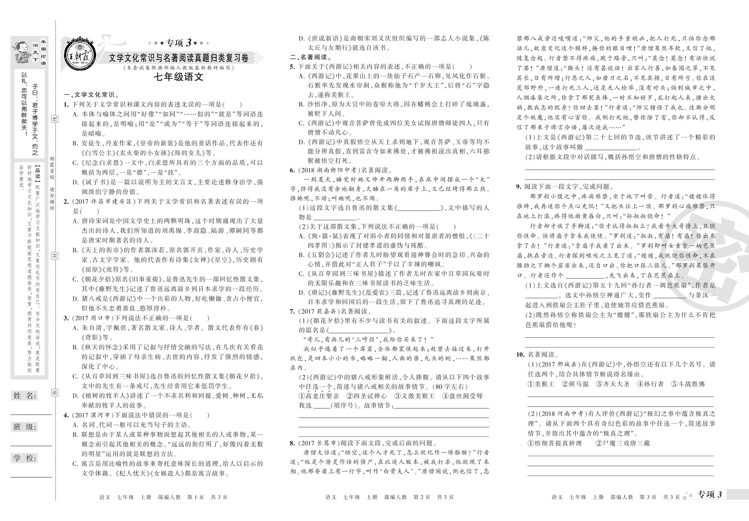 王朝霞期末专项卷——文学文化常识与名著阅读、综合性学习真题归类复习卷七年级上册语文(人教版)_R210802161535【0】