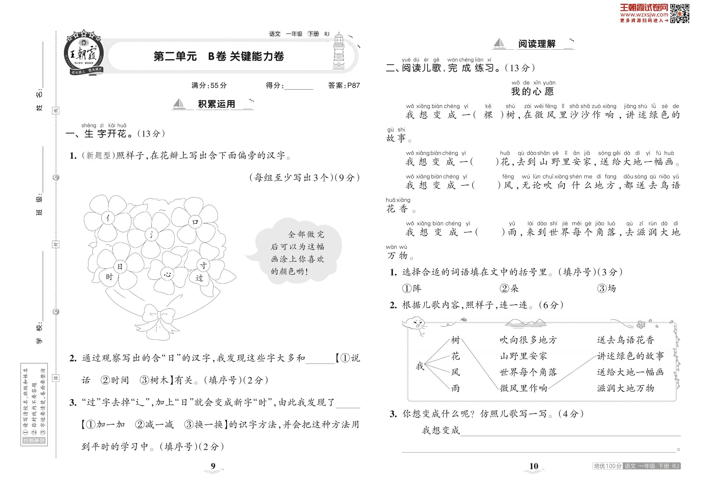 2023下册一年级语文人教版 第二单元 B卷 关键能力卷