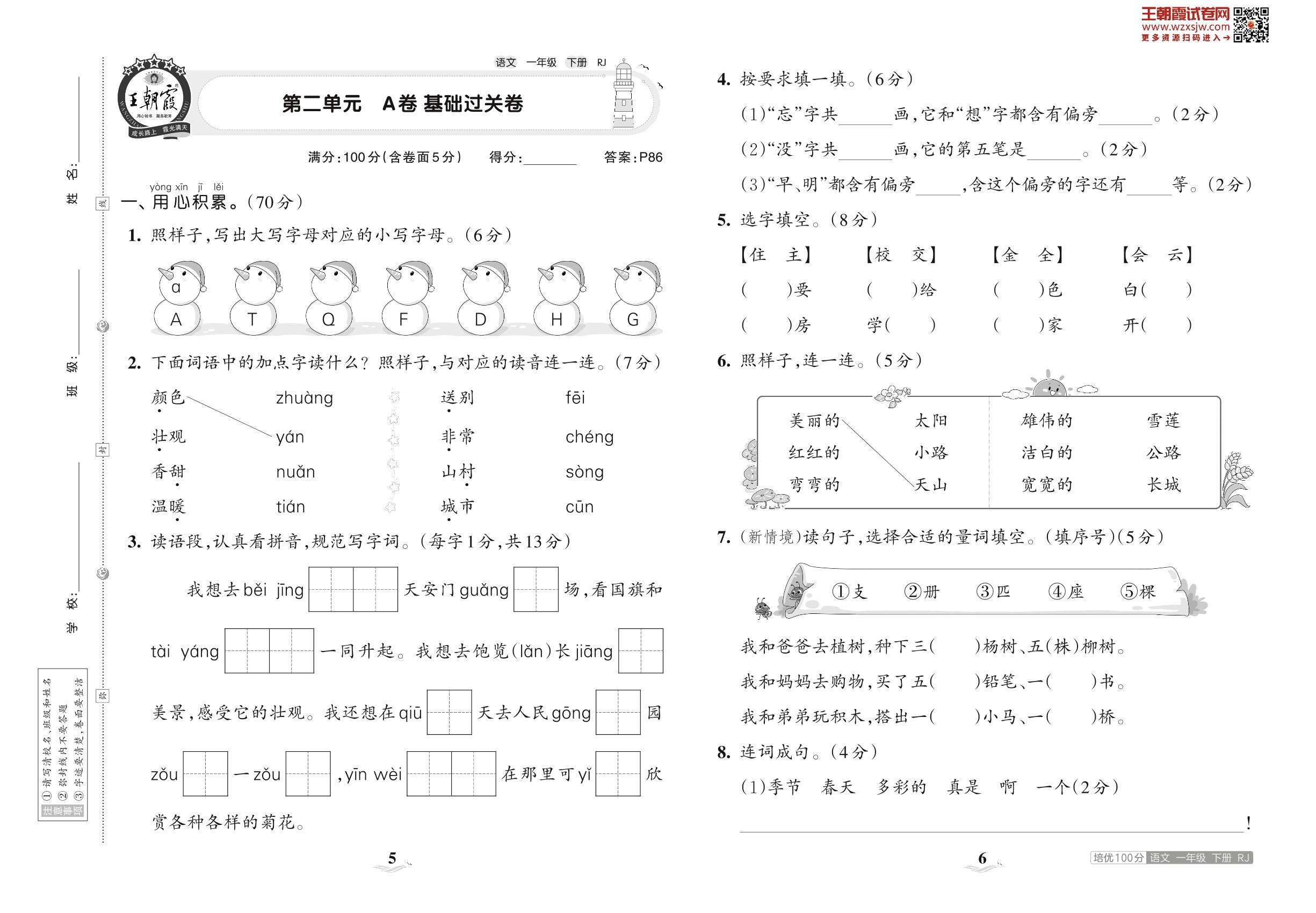 2023下册一年级语文人教版 第二单元 A卷 基础过关卷