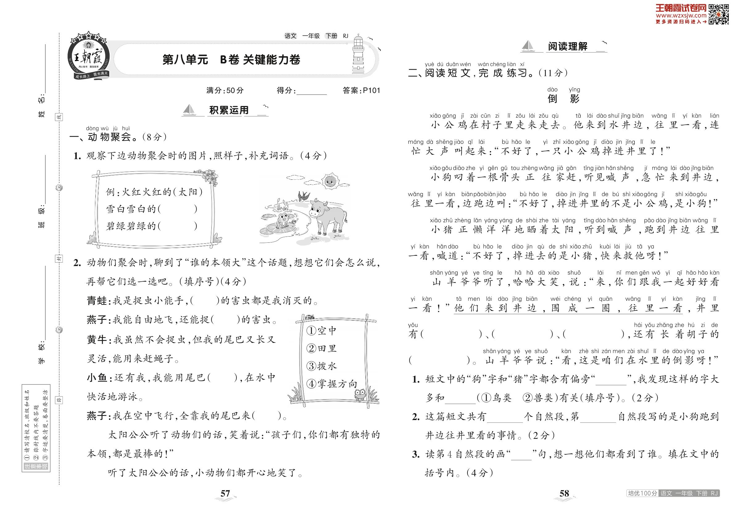 2023下册一年级语文人教版 第八单元 B卷 关键能力卷