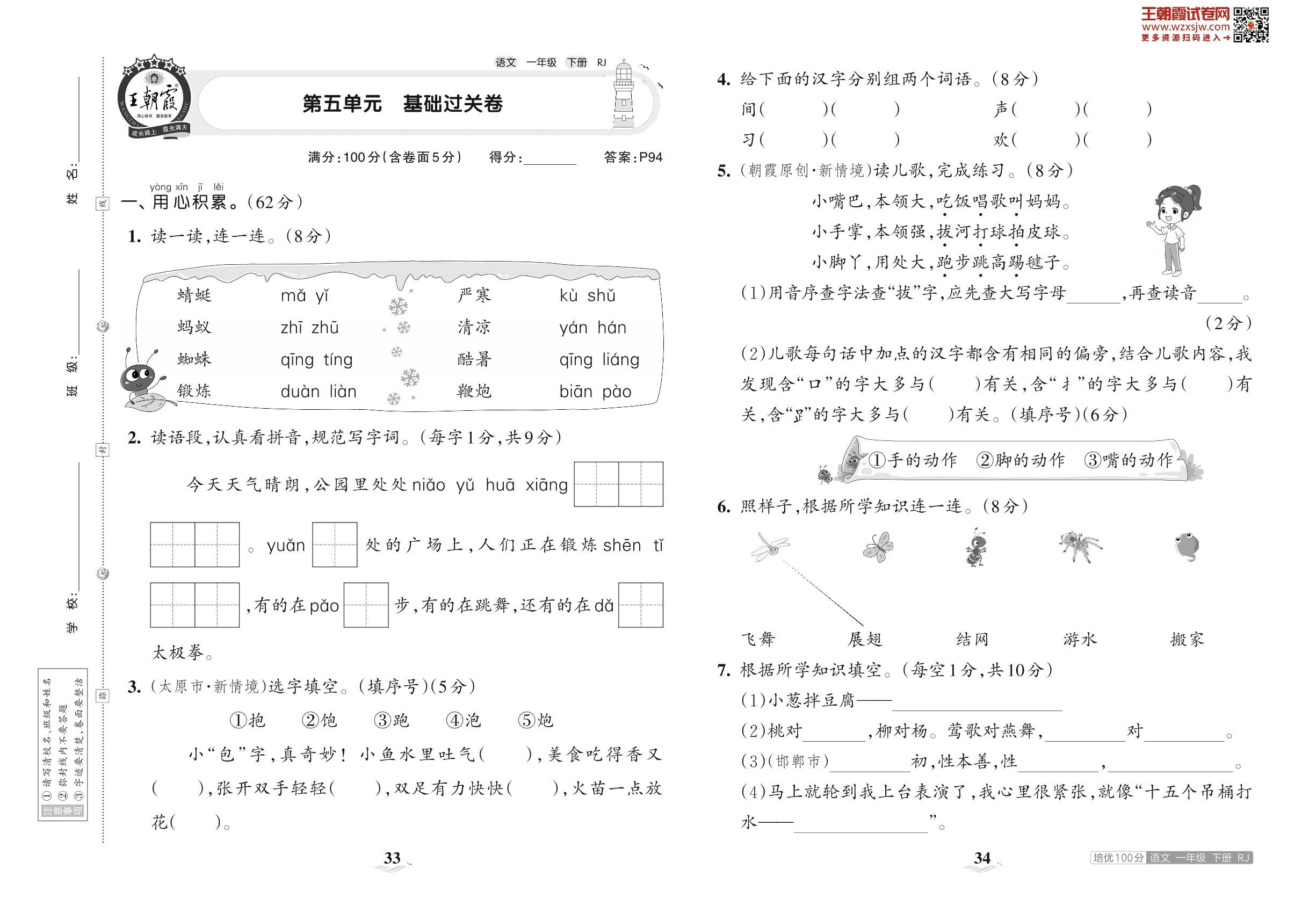 2023下册一年级语文人教版 第五单元 基础过关卷
