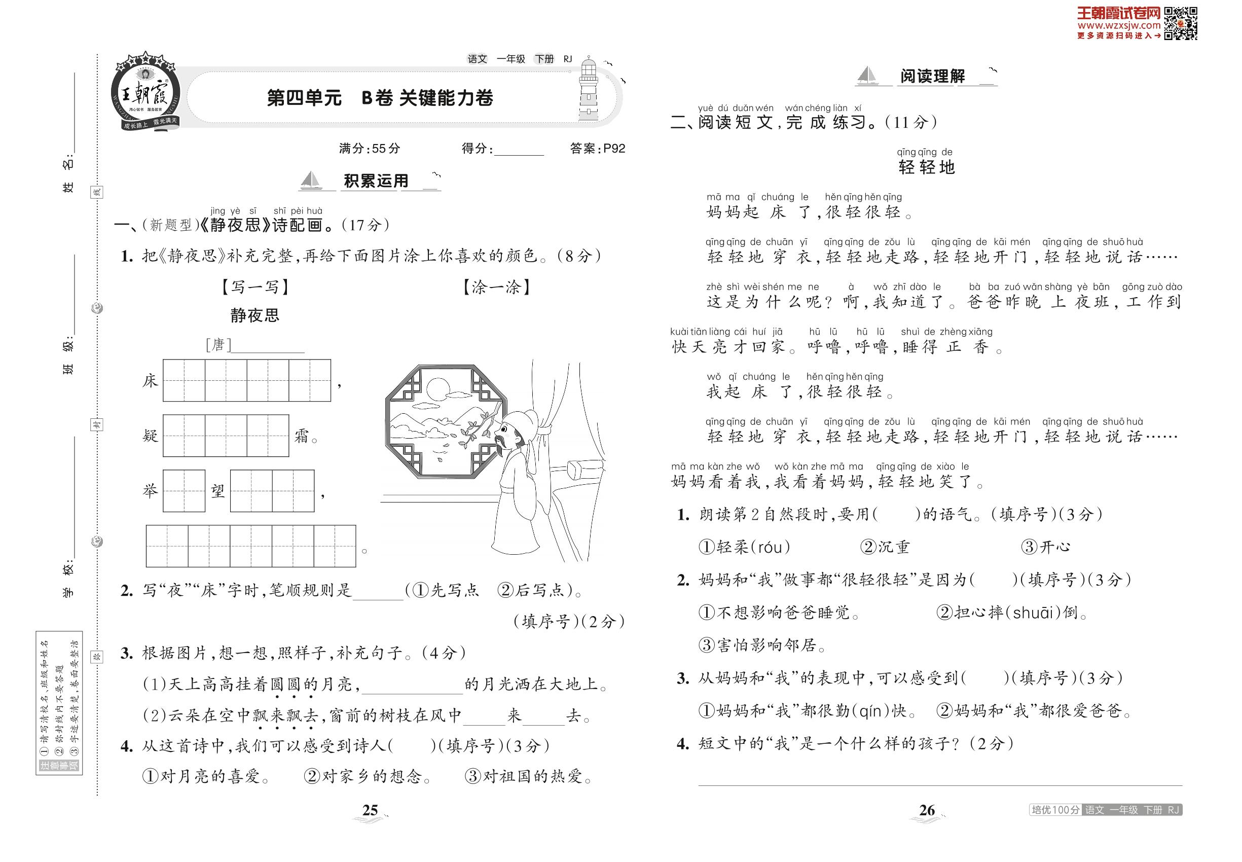 2023下册一年级语文人教版 第四单元 B卷 关键能力卷