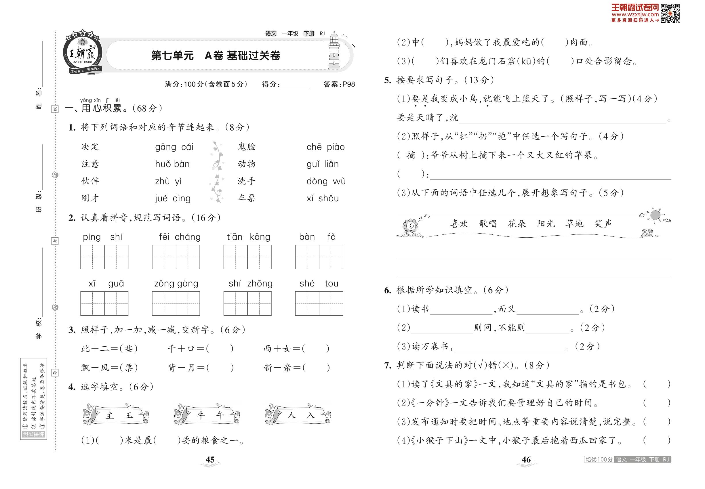 2023下册一年级语文人教版 第七单元 A卷 基础过关卷