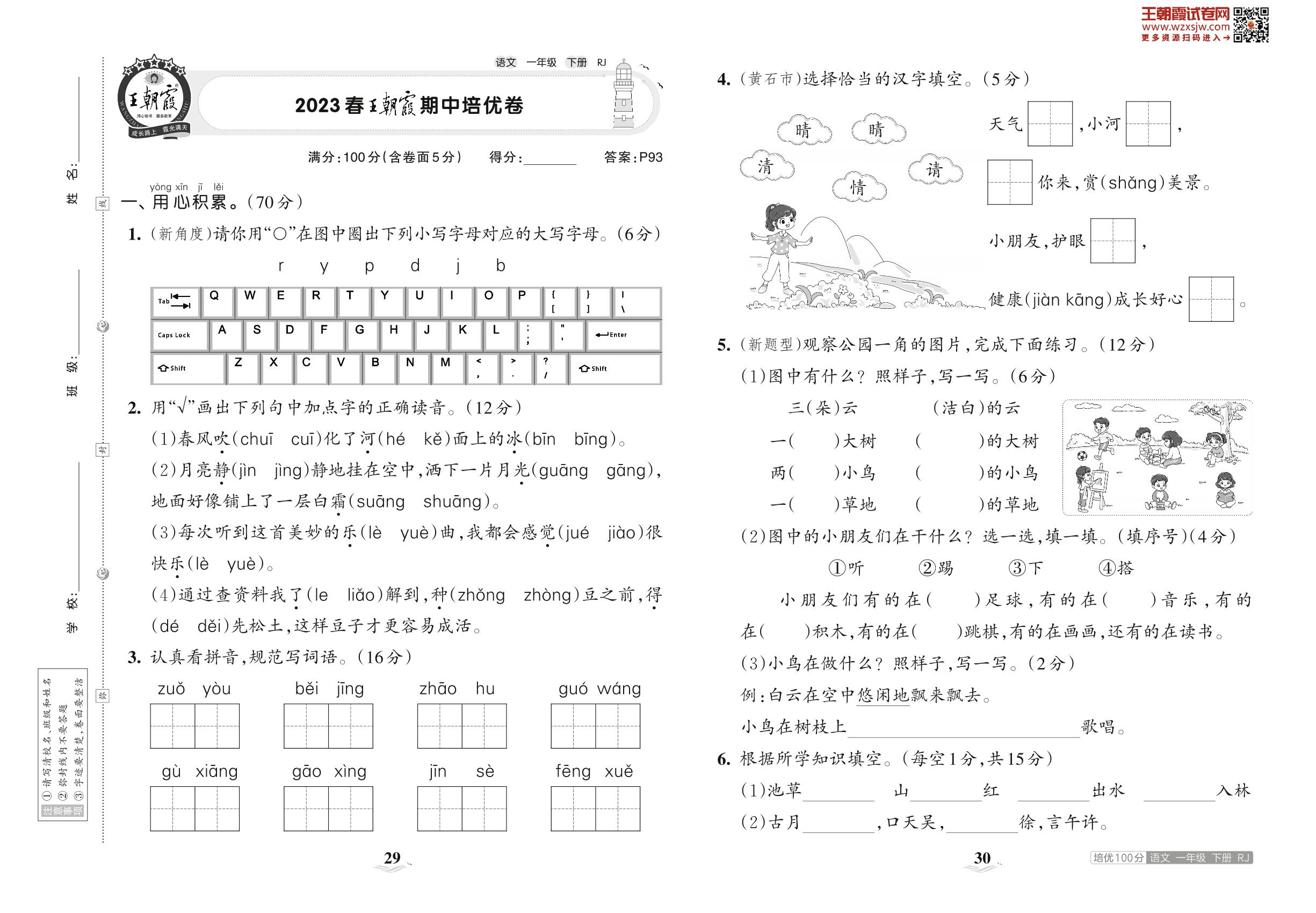 2023下册一年级语文人教版 2023春王朝霞期中培优卷