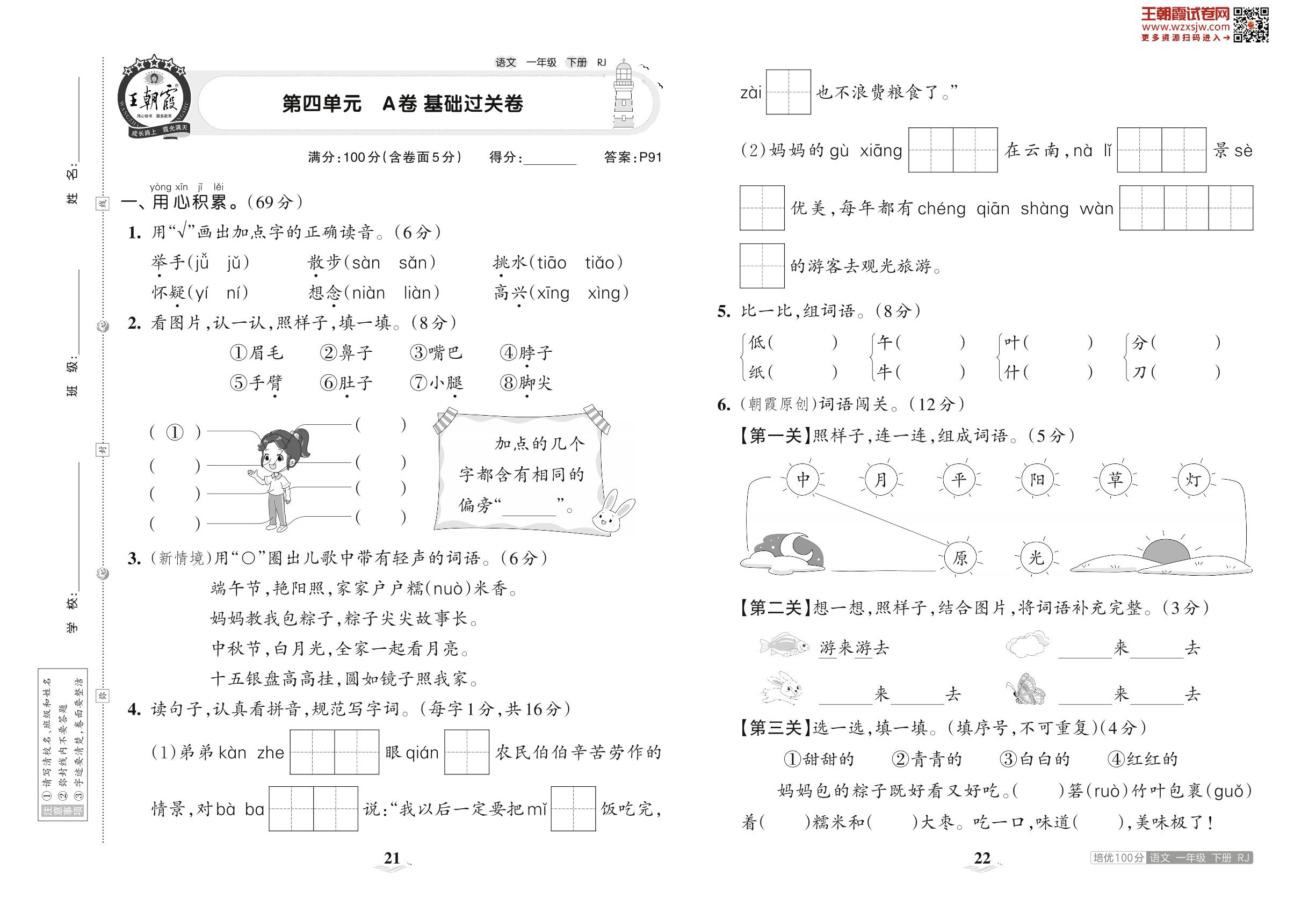 2023下册一年级语文人教版 第四单元 A卷 基础过关卷