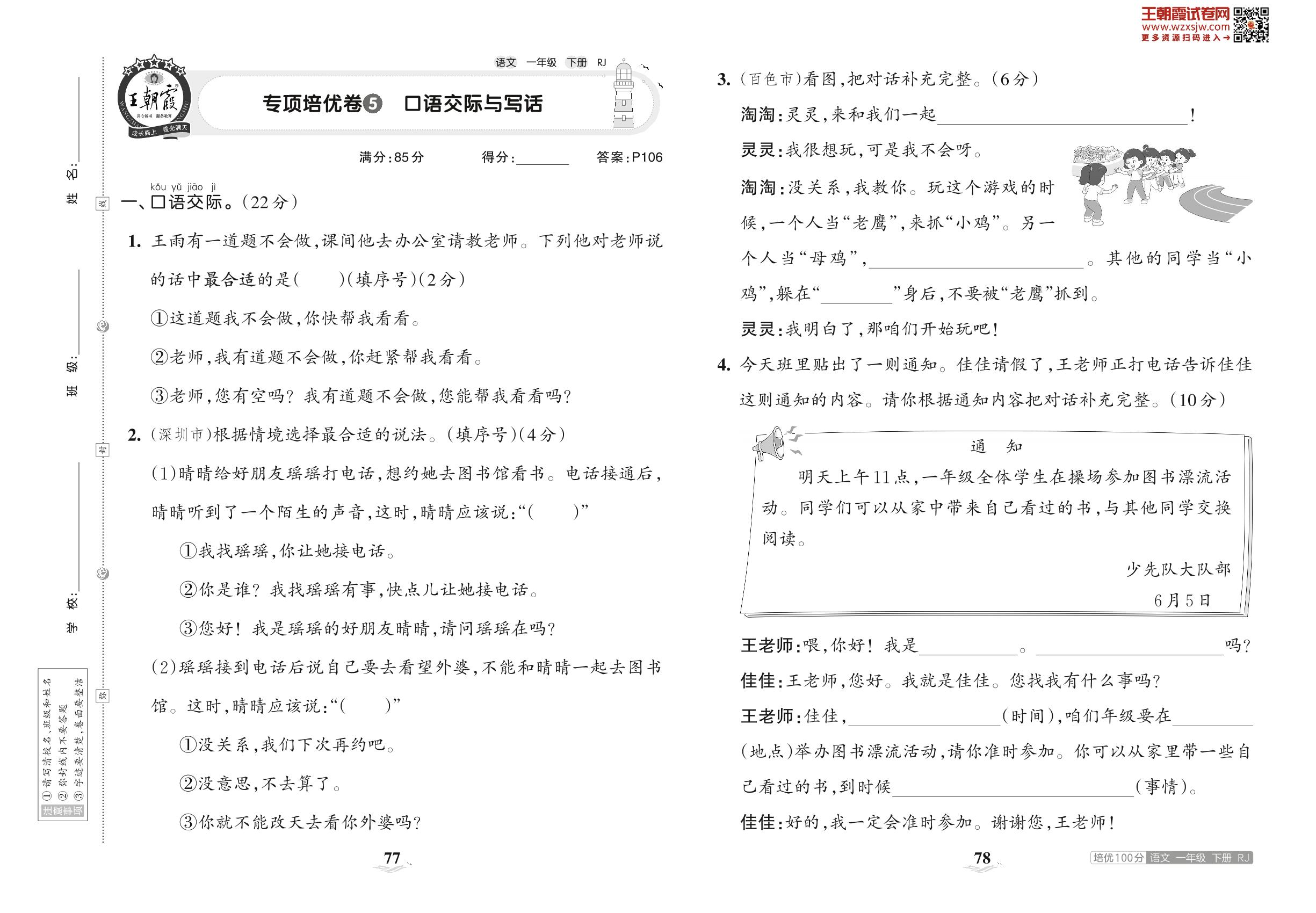 2023下册一年级语文人教版 专项培优卷5 口语交际与写话
