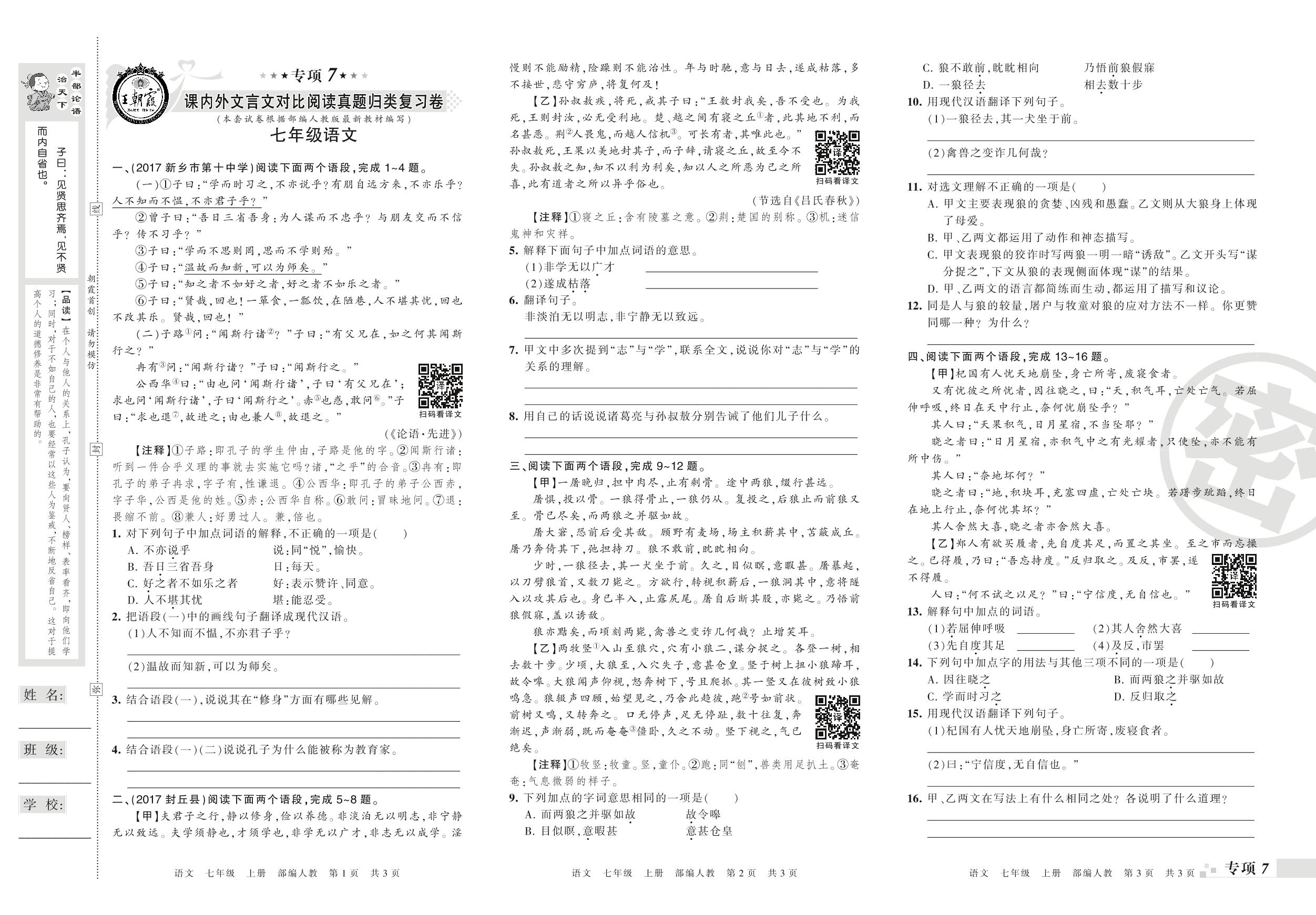 王朝霞期末专项卷——课内外文言文对比阅读、古诗词阅读真题归类复习卷七年级上册语文(人教版)_R210802161609【0】