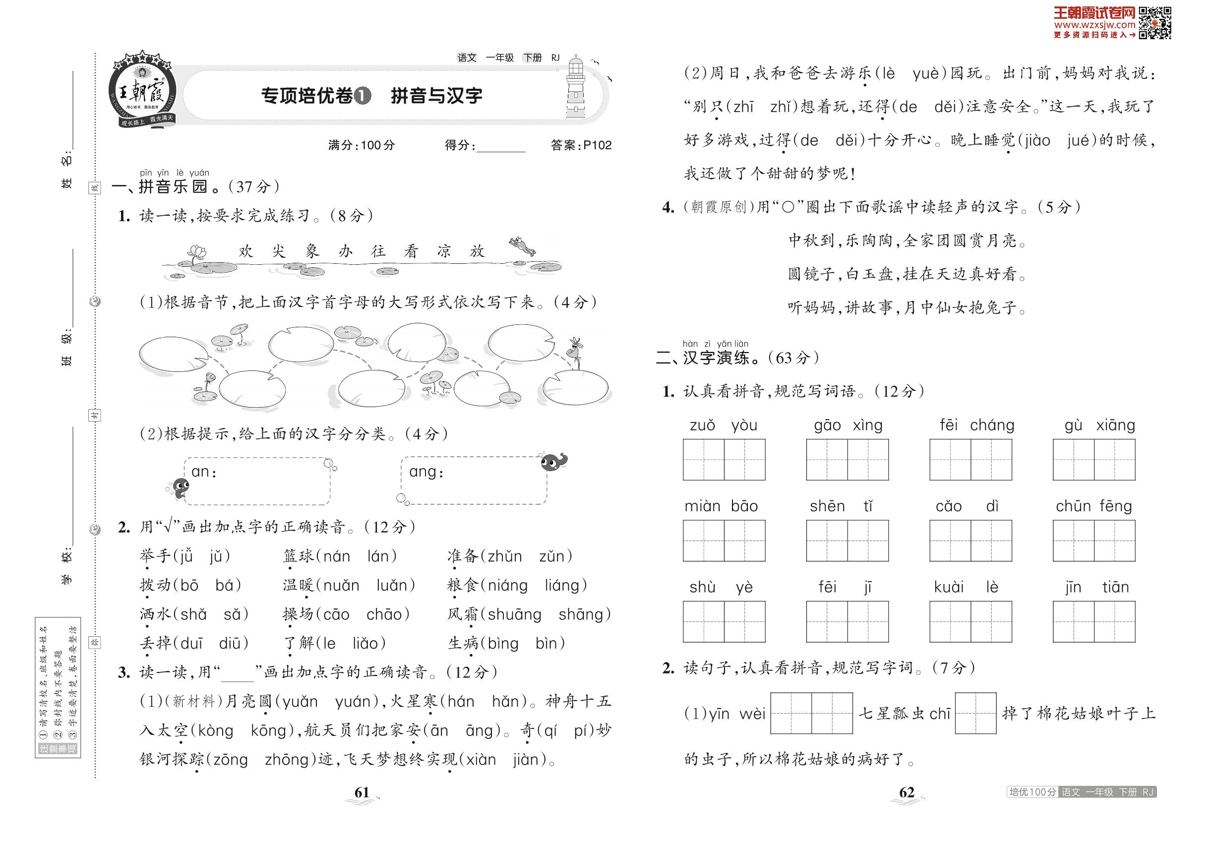 2023下册一年级语文人教版 专项培优卷1 拼音与汉字
