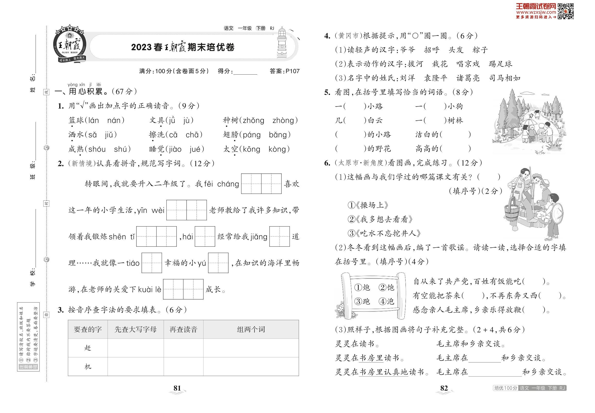 2023下册一年级语文人教版 2023春王朝霞期末培优卷