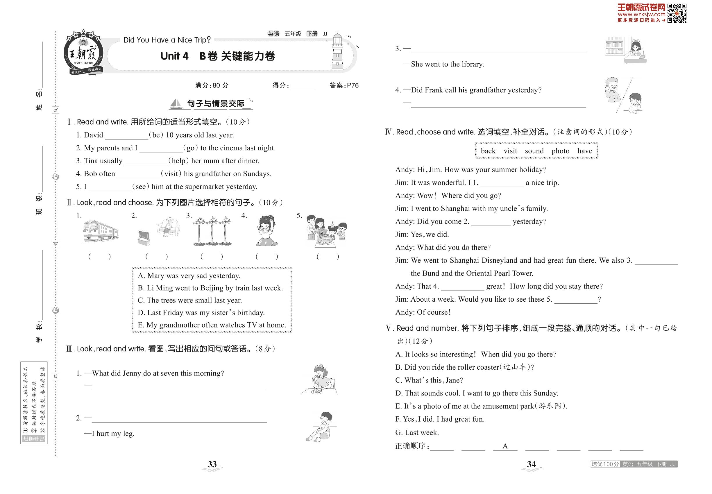 2023下册五年级英语冀教版 Unit 4 B卷 关键能力卷