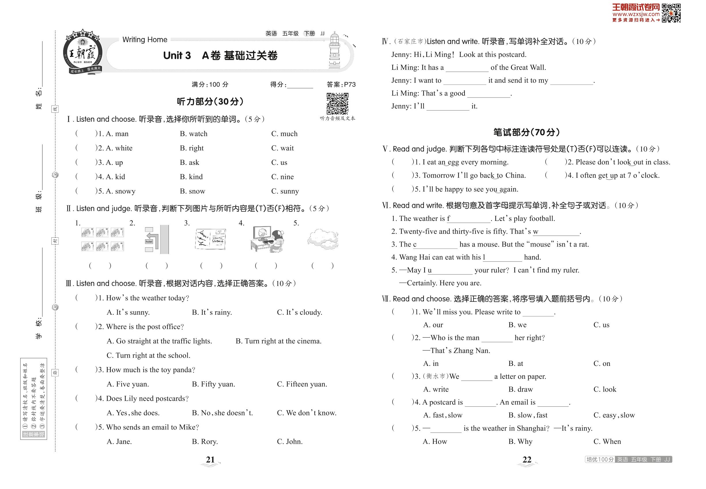 五年级英语冀教版下册单元卷