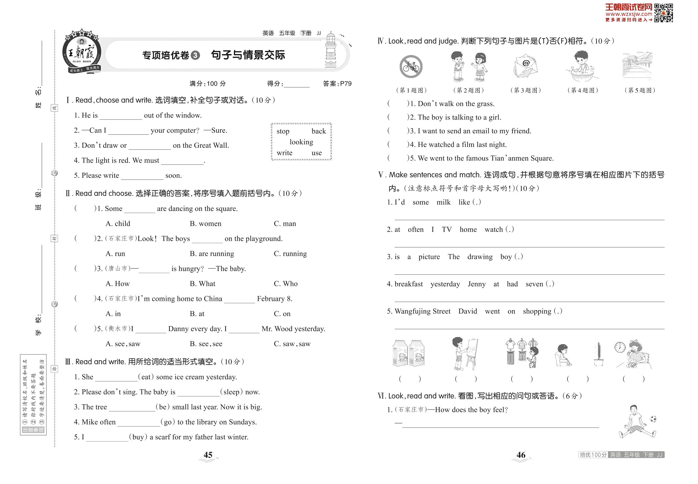 2023下册五年级英语冀教版 专项培优卷3 句子与情景交际