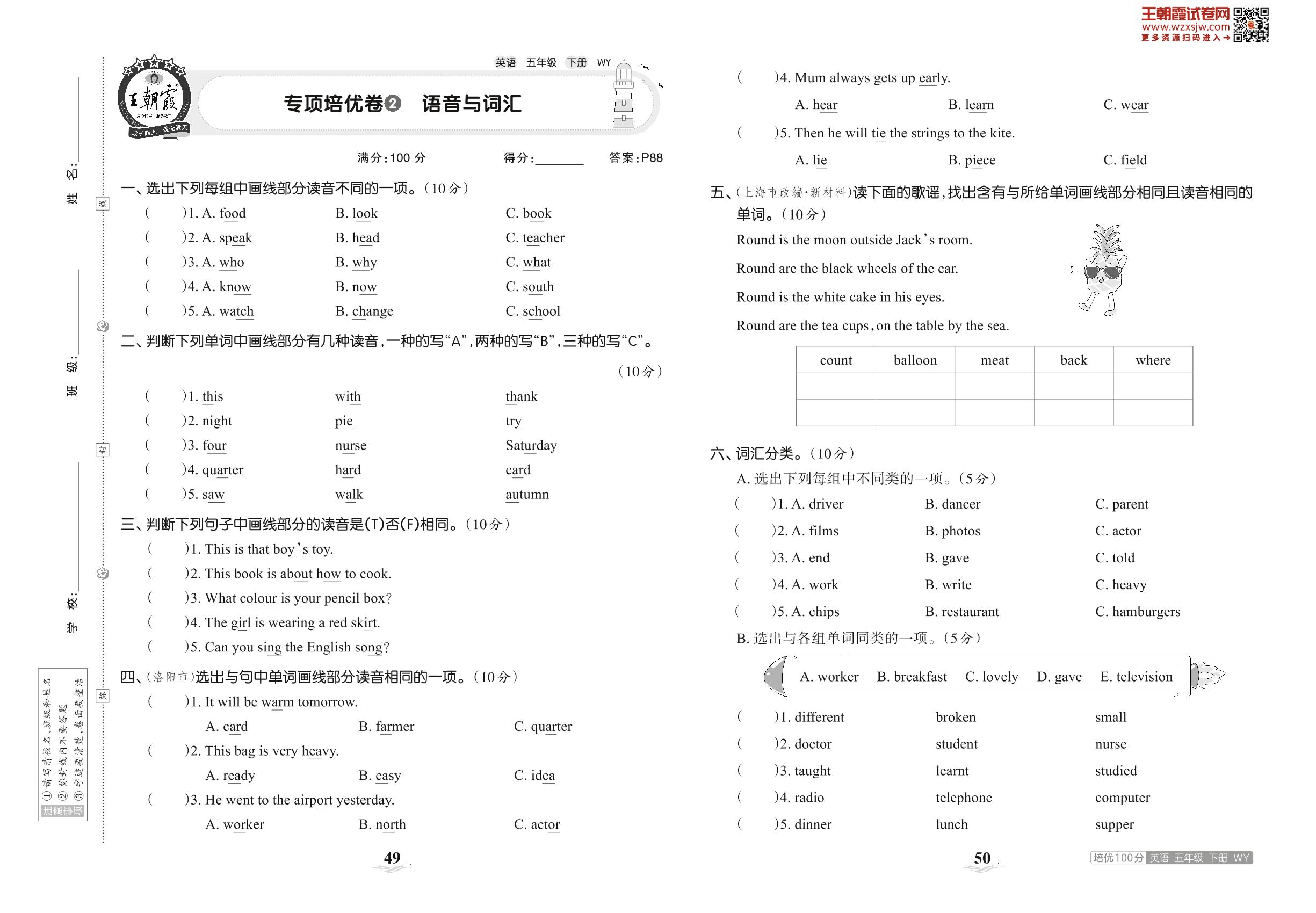 2023下册五年级英语外研版 专项培优卷2 语音与词汇