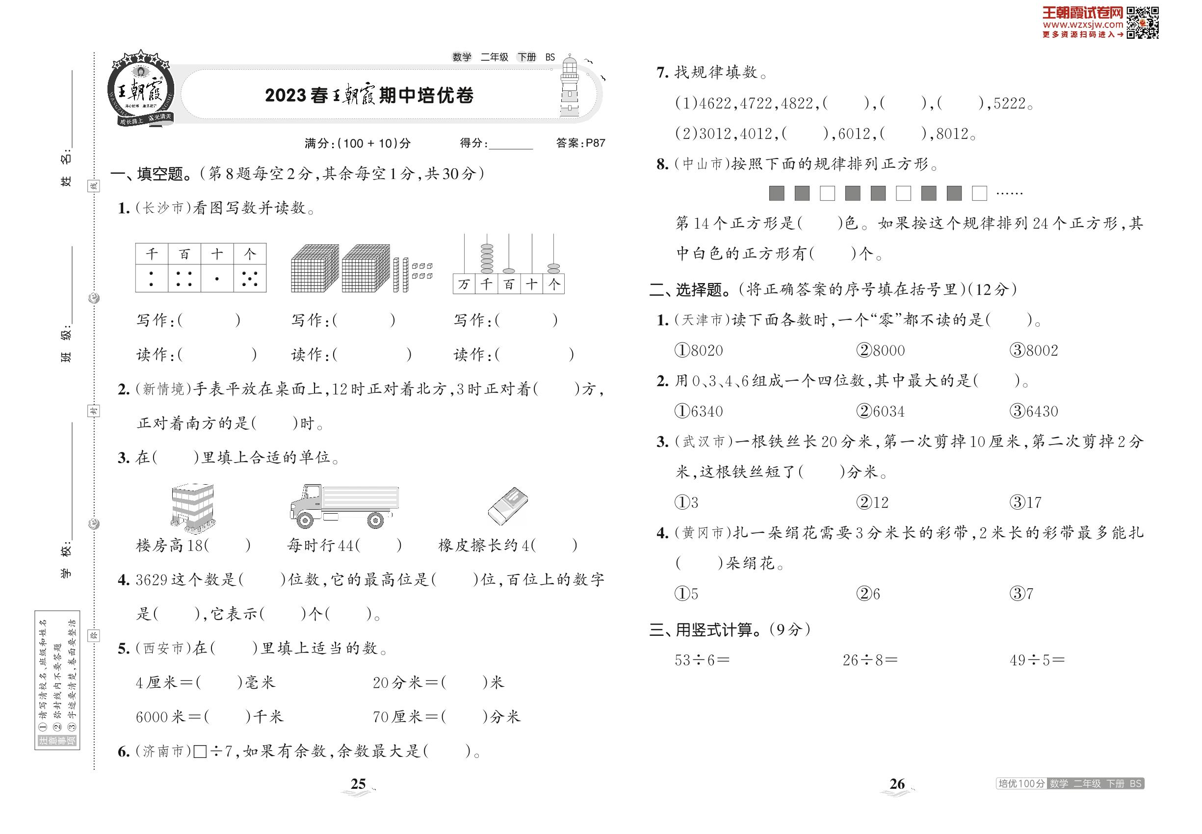 2023下册二年级数学北师版 2023春王朝霞期中培优卷