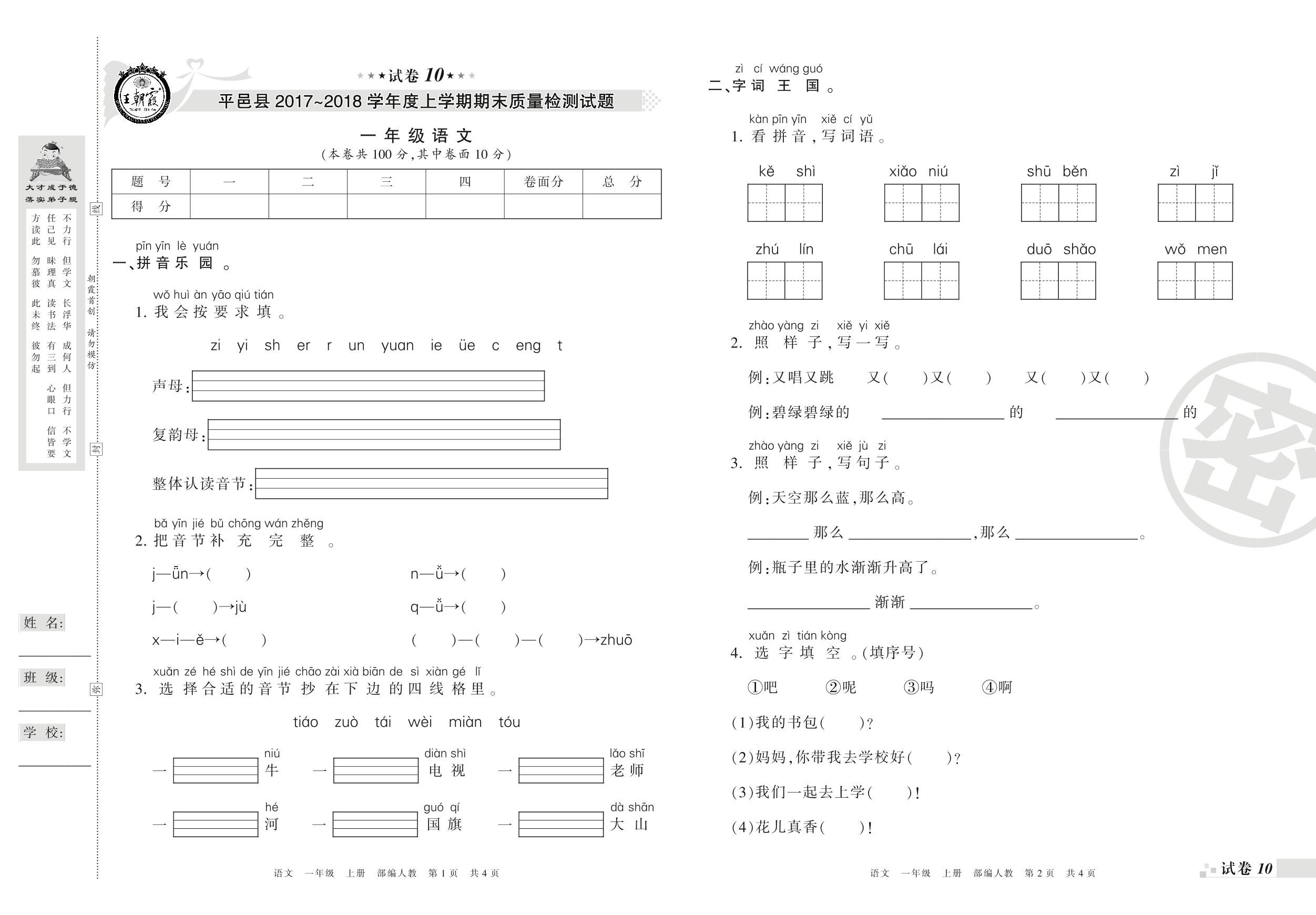 2017-2018学年第一学期临沂市平邑县一年级语文试卷(人教版)【10】