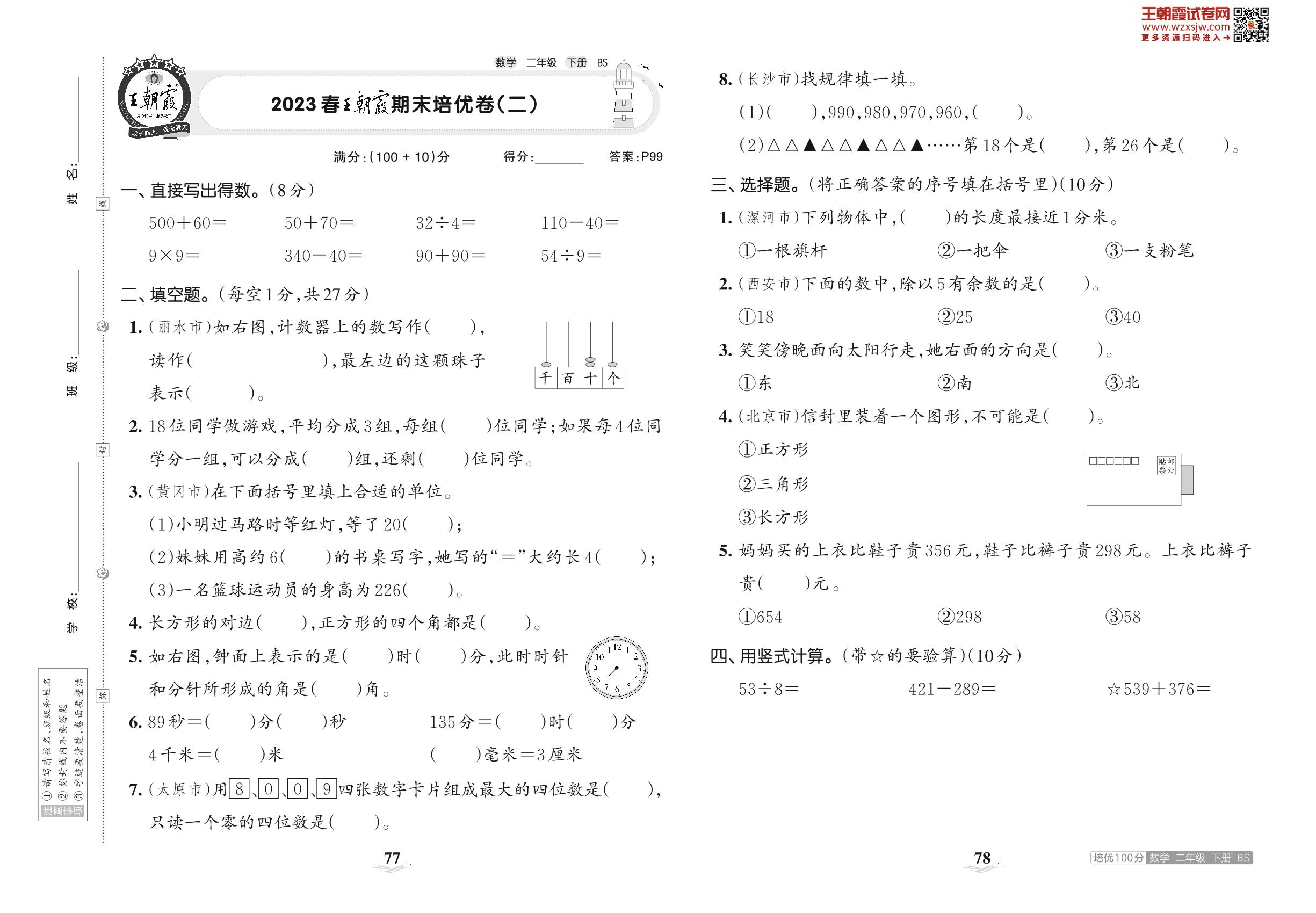 2023下册二年级数学北师版 2023春王朝霞期末培优卷(二)